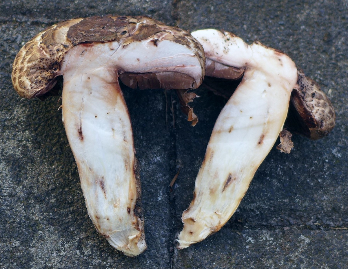 Leider hatte ich gestern keinen Schnitt durch den Fruchtkörper vorgenommen. Heute verfärbt sich das Fleisch nach dem Schnitt schwach bräunlich, nicht rötlich. Der Geruch iist heute (wie gestern) wenig angenehm, aber nicht so stark wie beim Exemplar oben.