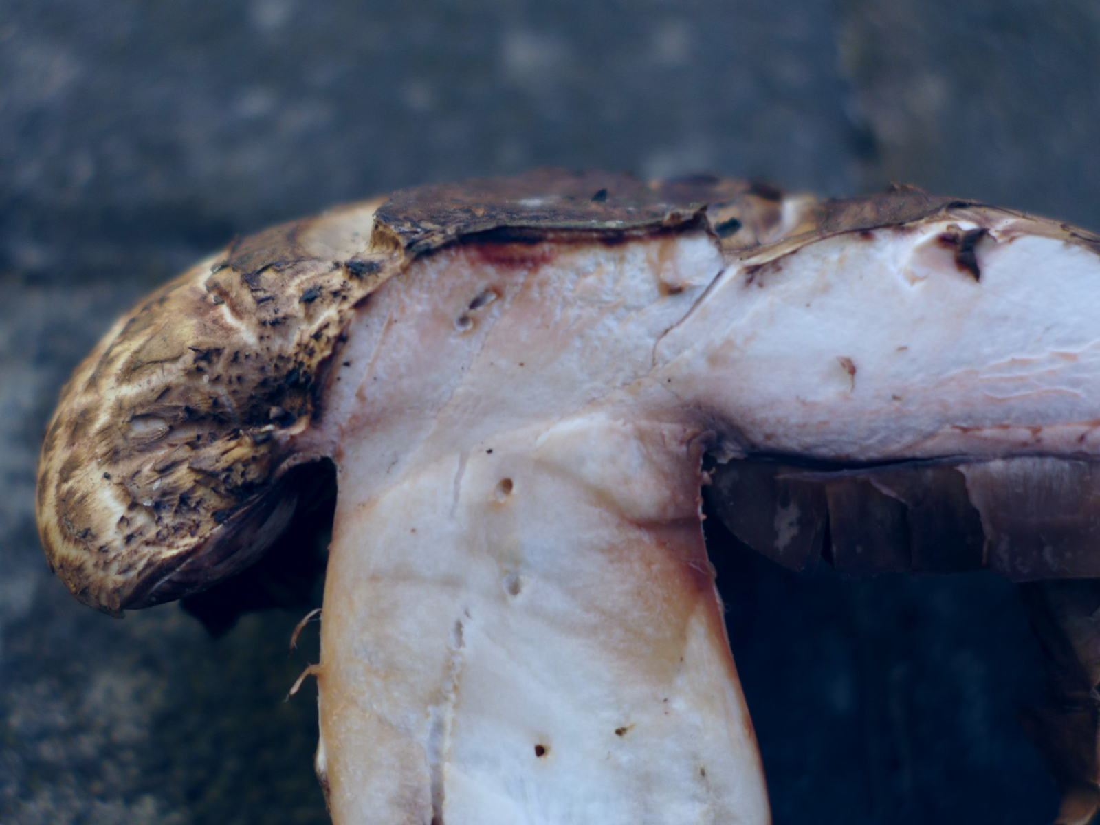 (6a) Das Fleisch rötet nach dem Schnitt stellenweise im Hut und im Stiel.