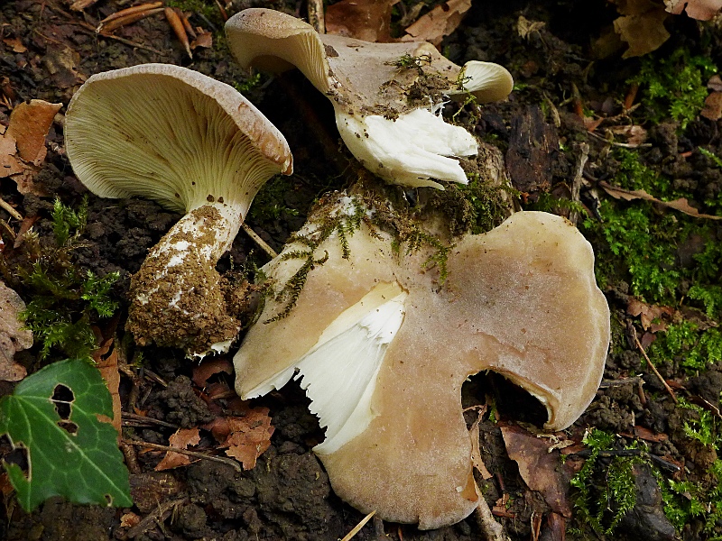 Lamellen weißlich, cremefarben, etwas untergemischt, etwas am Stiel herablaufend