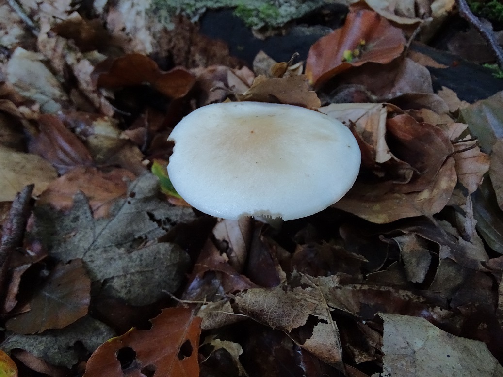 der Pilz erinnert mich irgendwie an einen gefleckten Rübling, Rhodocollybia maculata. Auch wenn die typischen braun-rosa Flecken hier noch fehlen.