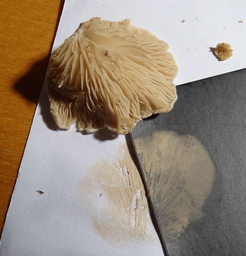 Ich hatte jetzt auch so einen Fall (noch nicht gezeigt, auch nicht so interessant: komische stummelfußähnliche Geschichten an liegendem Kiefernstamm, schon mehrere Wochen beobachtet, verändern sich kaum, nur 1,5 -2 cm groß, maximal, sehr zerbrechliches Fruchtfleisch.)Da hatte ich mal eine Probe zum Aussporen abgelegt, nur ein Hauch Sporenpulver, ich "sah" WEISS (und dachte: sollte das etwas der Ohrförmige Seitling Pleurocybella porrigens sein??? so klein, so zerbrechlich ???)