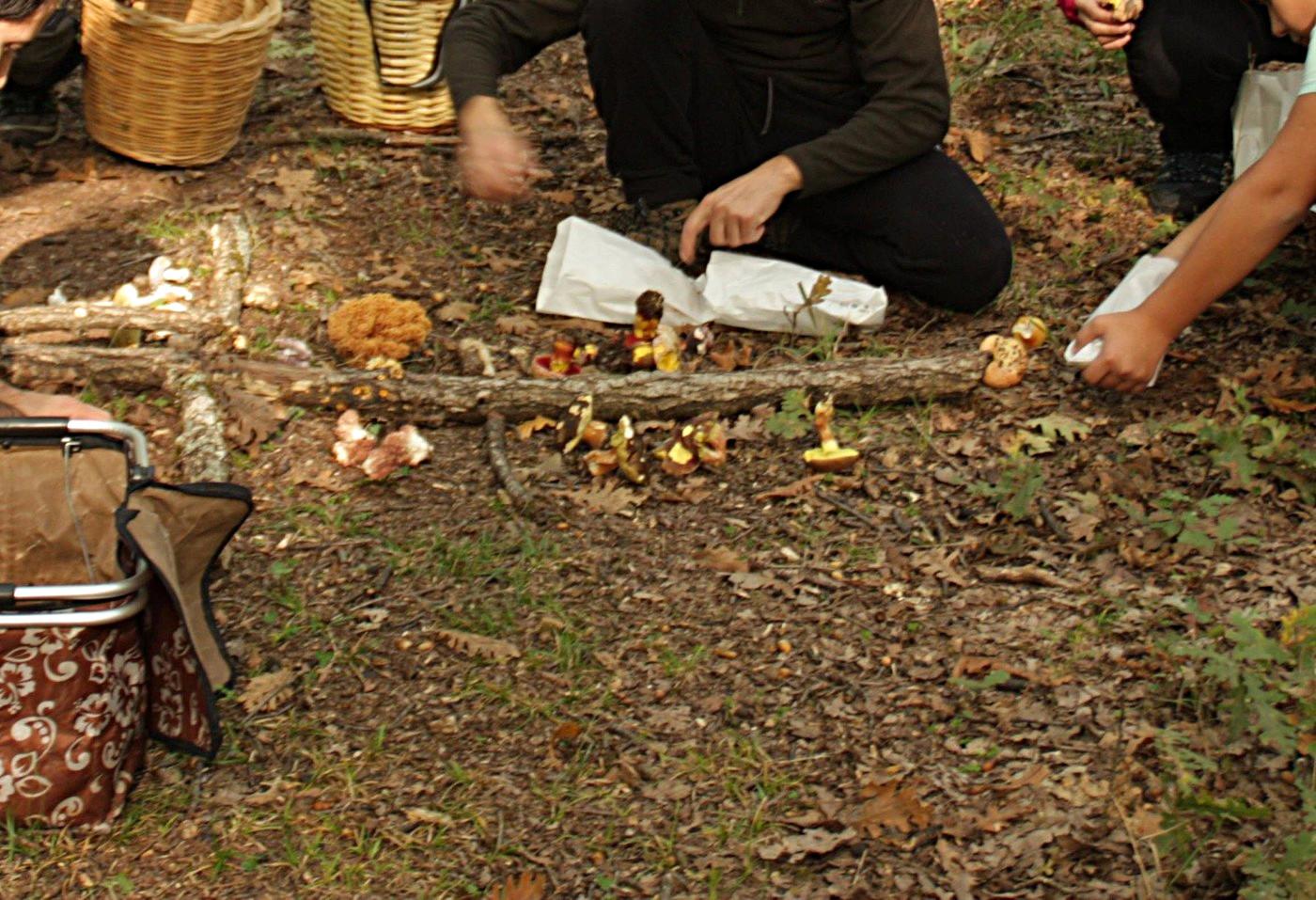 04. Im Wald ging es dann los mit der ersten Lektion - erstmal überhaupt die Vielfalt der Pilze kennen zu lernen. Das ging ganz pragmatisch - jeder sollte zwei verschiedene Pilze suchen, und die wurden dann ruckzuck rechts und links von einem Ast auf dem Waldboden aufgebaut, auf einer Seite die essbaren auf der anderen Seite gegenüber die giftigen Verwechslungspartner. Richtig schön einprägsam, die Methode hat mir gut gefallen.