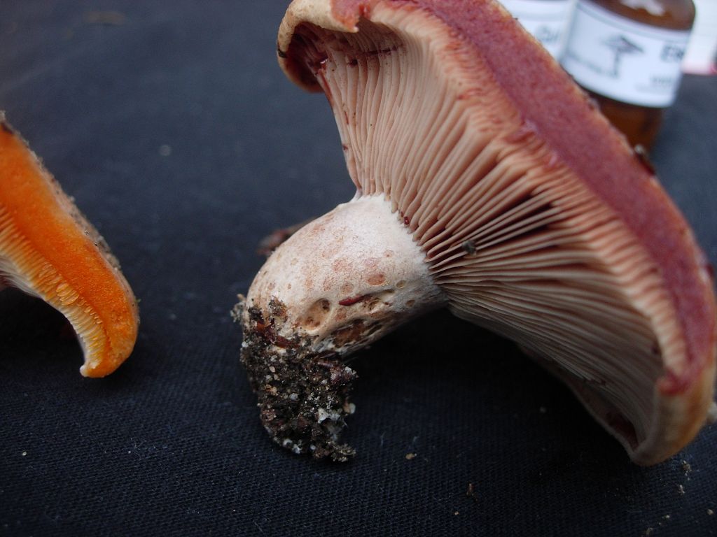 Verwechslung: Der Weinrote Kiefern-Reizker ist durch seine unveränderliche Weinrote Milch einfach zu bestimmen.