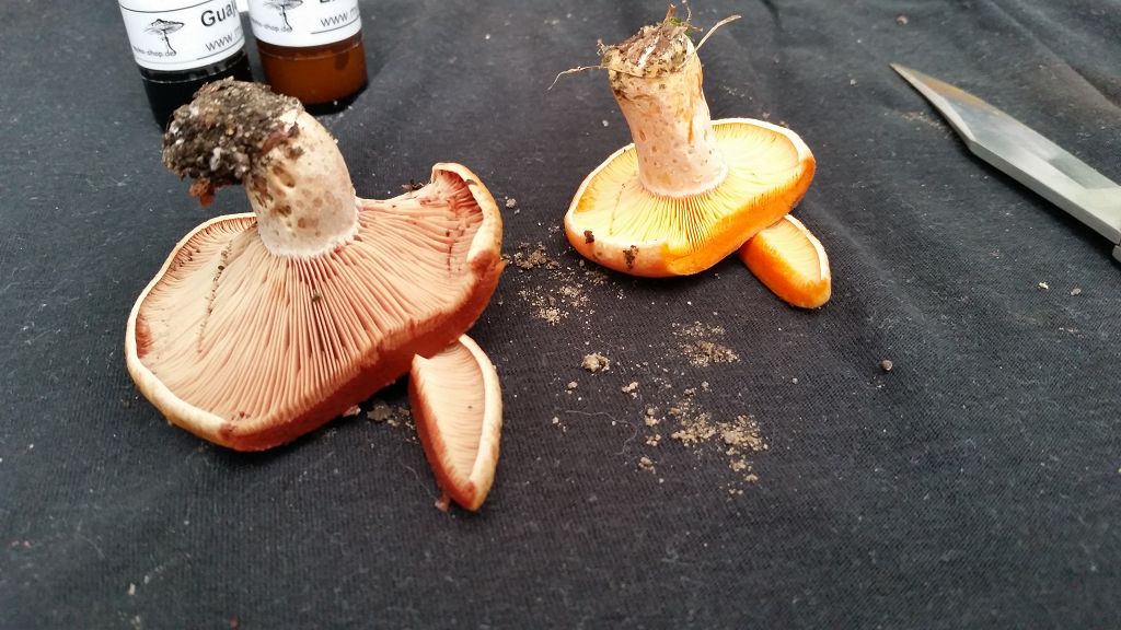 Orange Milch erst nach einiger Zeit (15-30 Min.) Rot, Fleisch un Milch nach einige Stunden Grün, keine grübchen am Stiel. Bei Fichte.