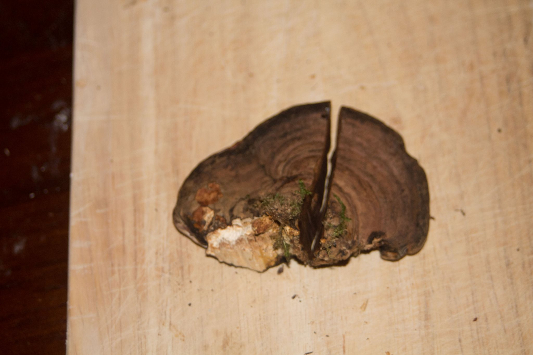 Hier ein Bild meines getrockneten Lackporlings. Er ist schon ein paar Jahre alt und im Laufe der Zeit etwas nachgedunkelt, sieht aber fast noch so aus, wie ich ihn gefunden habe.