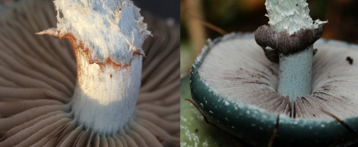 diese Woche gab es einen Ausflug in einen Laubwald in Losheim/Saarland. Neben den bekannten Röhrlingen und Parasolen waren für mich Höhepunkt und Erstfund diese blauen Gesellen. Wegen der Farbe kam ich schnell zum Blauen oder Grünspan-Träuschling. Ist das nun als Ring zu bezeichnen, was ich das sehe? Ich tendiere zum Grünspan-Träuschling?
