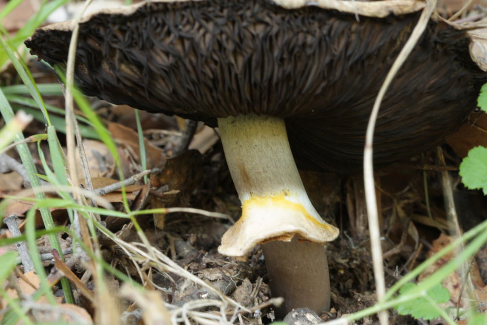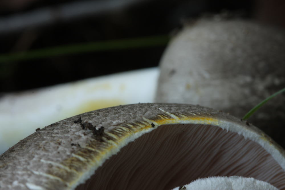 Die unten gezeigten Pilze weisen alle Merkmale des Perlhuhn-Champignons auf, inkl. deutlicher Tinten-Geruch, aber Fleisch und Stielbasis färben nur wenig im Schnitt. Stärkstes Gilben am Hutrand, am Ring und bei Berührung am Stiel.