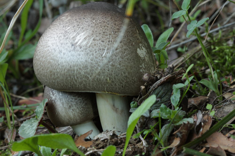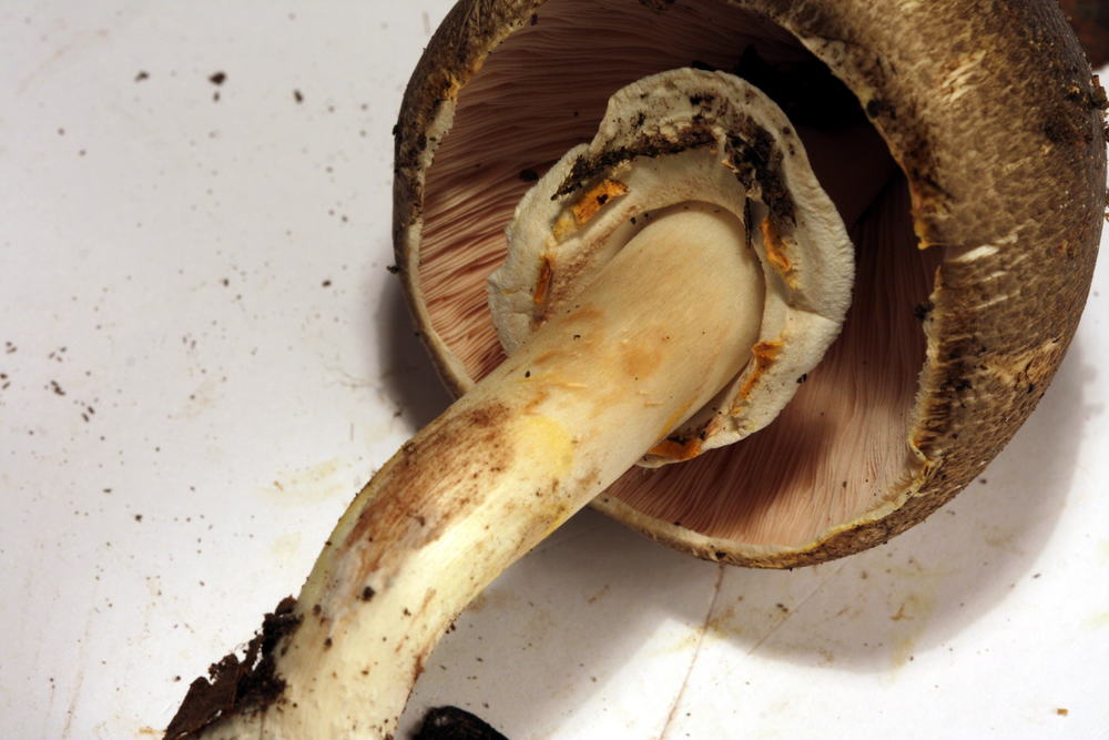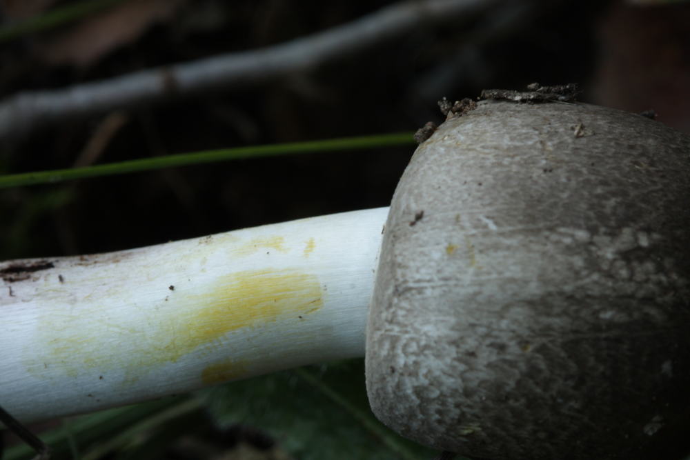 Die unten gezeigten Pilze weisen alle Merkmale des Perlhuhn-Champignons auf, inkl. deutlicher Tinten-Geruch, aber Fleisch und Stielbasis färben nur wenig im Schnitt. Stärkstes Gilben am Hutrand, am Ring und bei Berührung am Stiel.