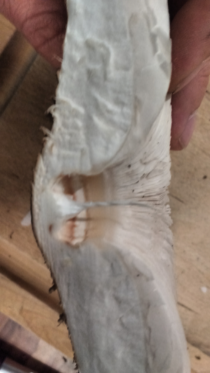 und: schwer auf den Bildern zu sehen, aber die Lamellen haben m. E. nach einen leichten rosa Schimmer ... von unten betrachtet. Wenn man ihn dann schneidet, schauen sie im Vgl zum weißen Fleisch eher cremefarben aus.