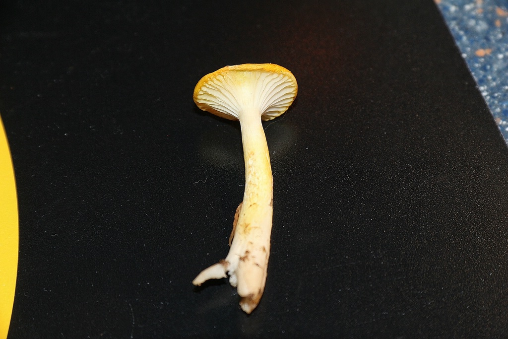 Aber den gelben kann man schon so ganz gut als Hygrocybe chlorophana annageln. ist ein variables Pilzchen, erkennbar an dem glatten, schmierigen Hut ohne Buckel, gelb, blassgelb oder auch mal gelborange, lamellen heller als Hutfarbe, immer tief ausgebuchtet angewachsen, Stiel in etwa wie Hut gefärbt und entweder trocken oder auch klebrig, aber immer glatt.