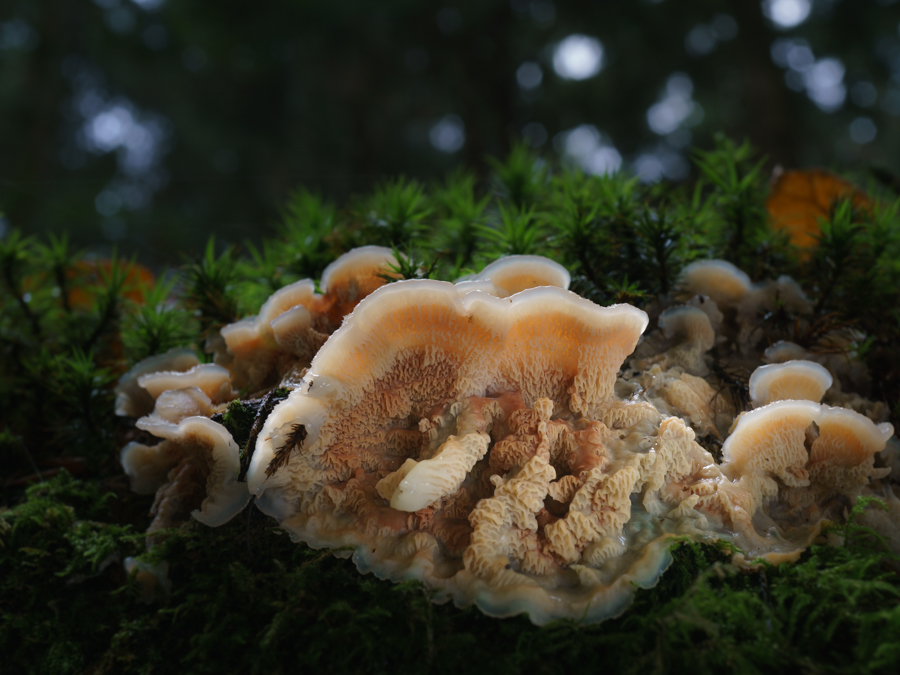 letzte Woche stieß ich diesen wunderschönen Pilz. Zu Hause wühlte ich mich durch meine Bestimmungsbücher und entdeckte im Parays den gefürchteten Hausschwamm, der sehr ähnlich aussieht. Kann das sein? Ist der nicht nur in Häusern? Leider habe ich mir nicht genau angesehen, auf welchem Holz er wuchs (war moosbedeckt). Vielleicht war da Bauholz vergraben. Oder kommt er auch auf gewachsenen Hölzern vor?