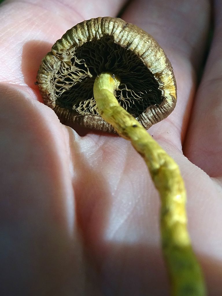 Sonstiges: Hutoberseite zimtbraun bis dunkelbraun, trocken-ledrig, Umgebung mit zimtbraunen Sporen übersät