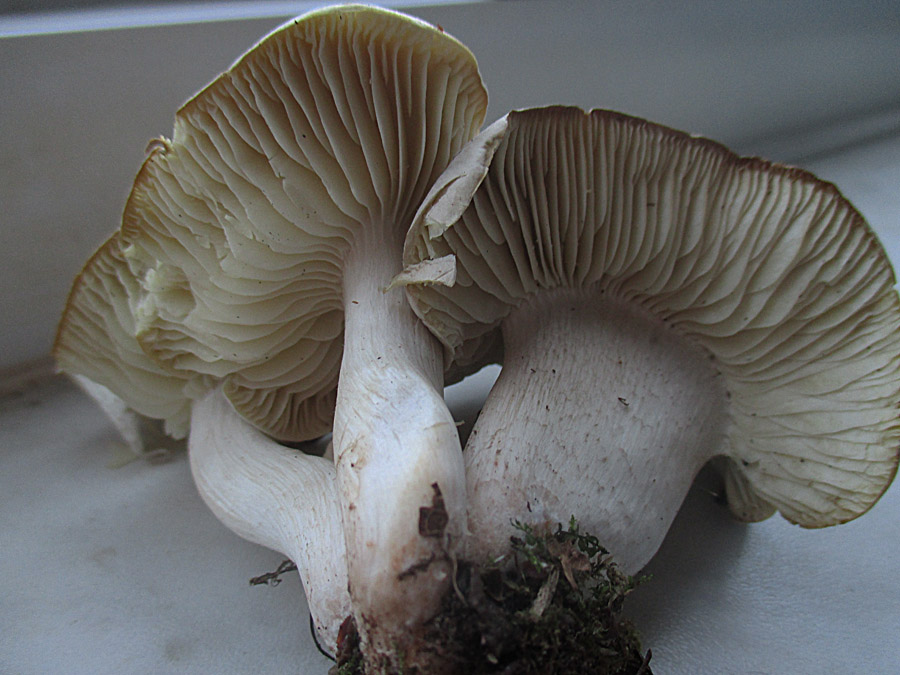 jetzt bei Kunstlicht ist ein leichtes Bräunen zu erkennen (nach vier Stunden) aber das muß ich bei Tageslicht noch einmal überprüfen. Tricholoma saponaceum war auch meine Idee. Mal sehen wie die morgen aussehen und riechen. Der Geruch soll sich manchmal auch erst nach längerer Zeit entwickeln.