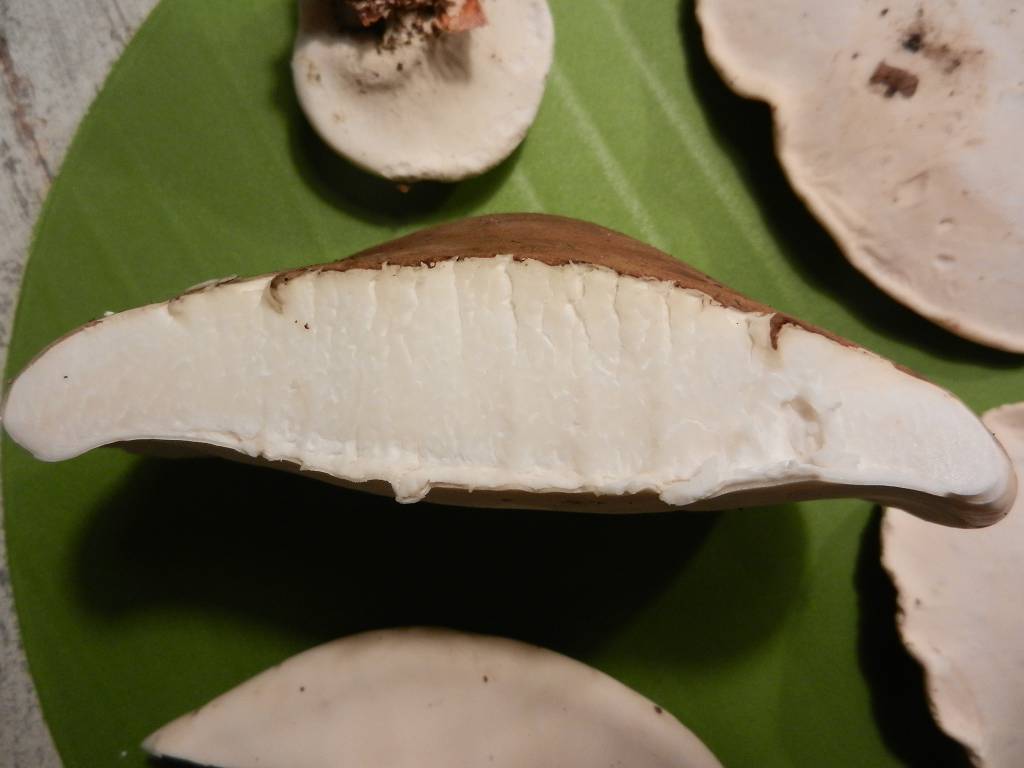 Fleisch: Festigkeit etwa wie ein angespannter Handballen (nicht extrem fest, aber auch nicht weich), Schnittfläche weiß bis leicht cremefarben, keine Verfärbung