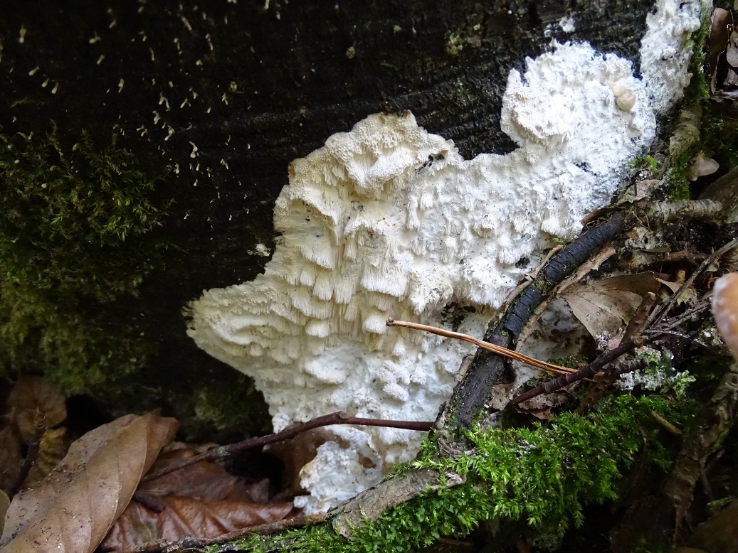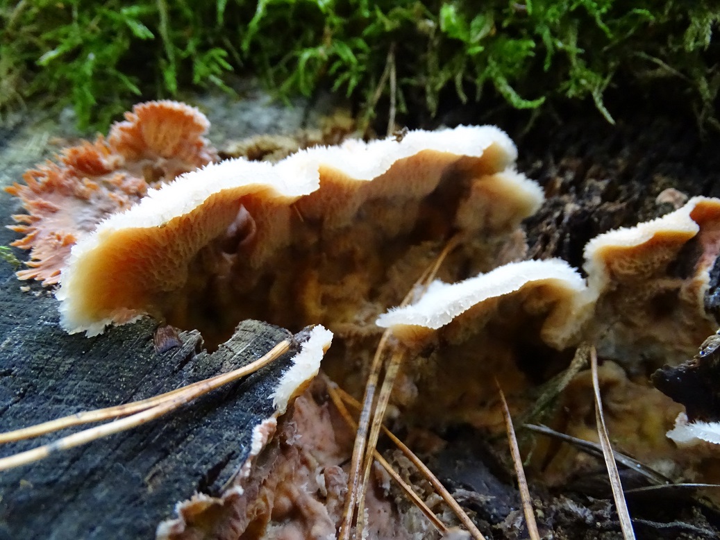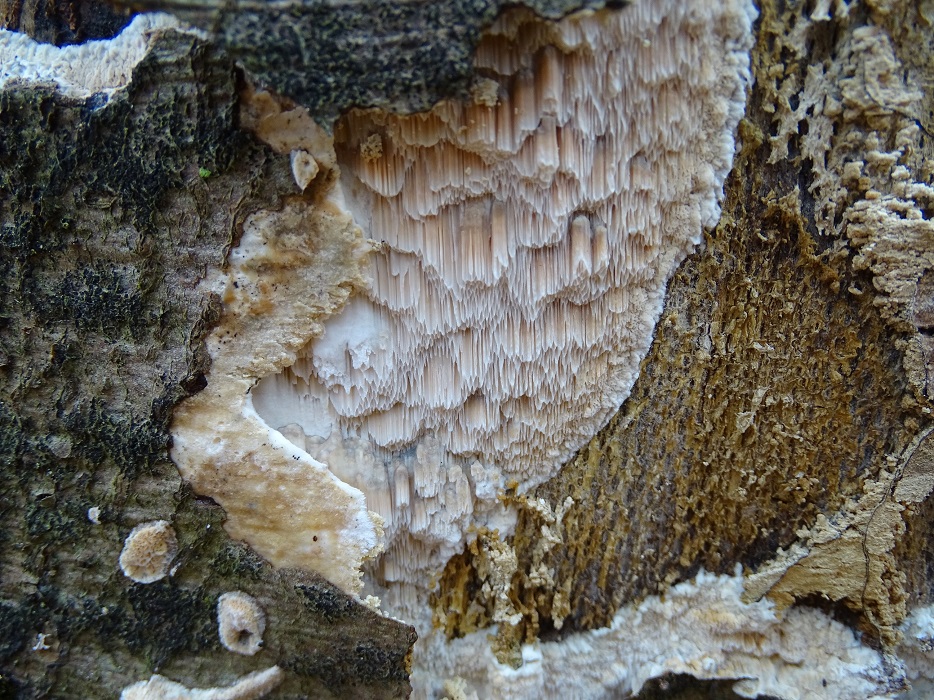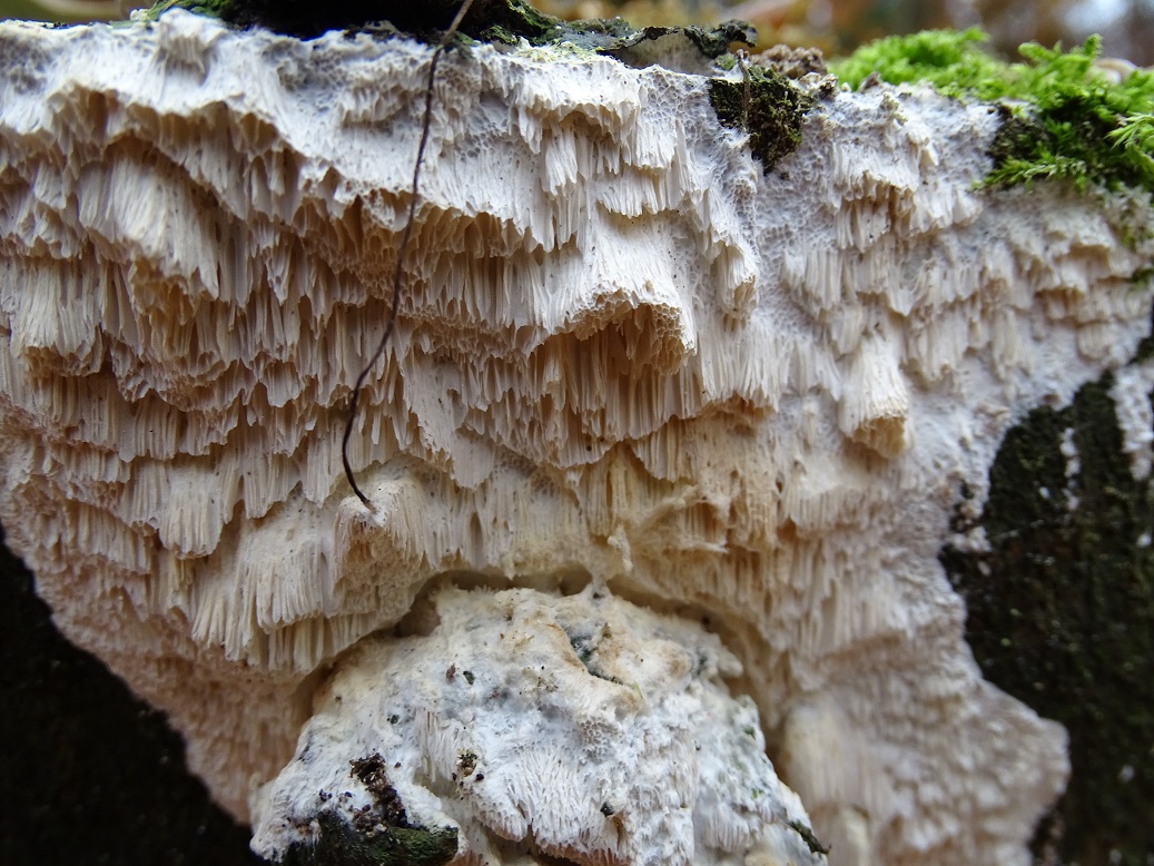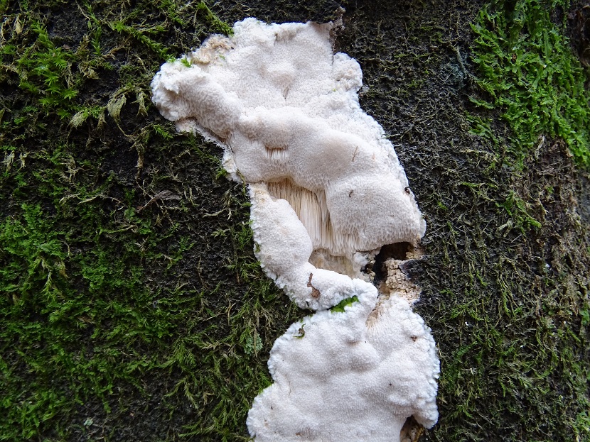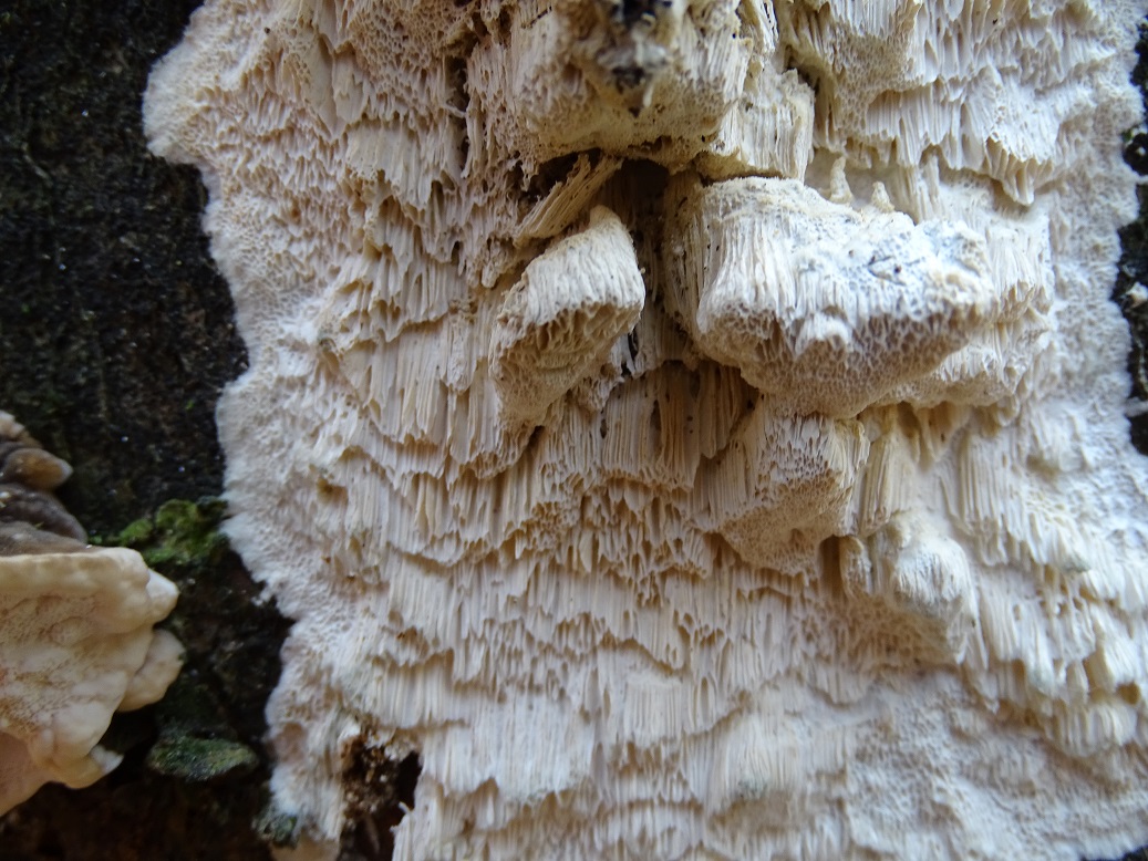 Der zweite ist interessant, wird aber schwierig. Abeja hat es schon angedeutet. In der Tat war Antrodia albida (weißliche Braunfäuletramete) auch meine erster Gedanke, aber ich kenne die mit noch mal mehr zerfransten Poren, auch an den Stellen, wo das Hymenium horizontal ausgerichtet ist. Andererseits hatte ich die noch nicht in so frisch gefunden. Doch da spielen möglicherweise noch ein oder zwei weitere Arten der Gattung mit. Zudem gibt es auch noch großporige Arten bei Oxyporus, die mir unbekannt sind. Die kann ich hier nicht ausschließen. Schizopora wurde schon genannt, aber da wäre die Wuchsweise tatsächlich sehr ungewöhnlich.