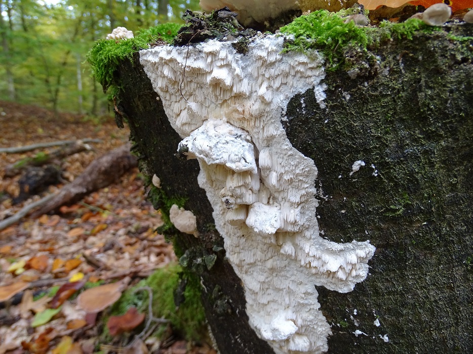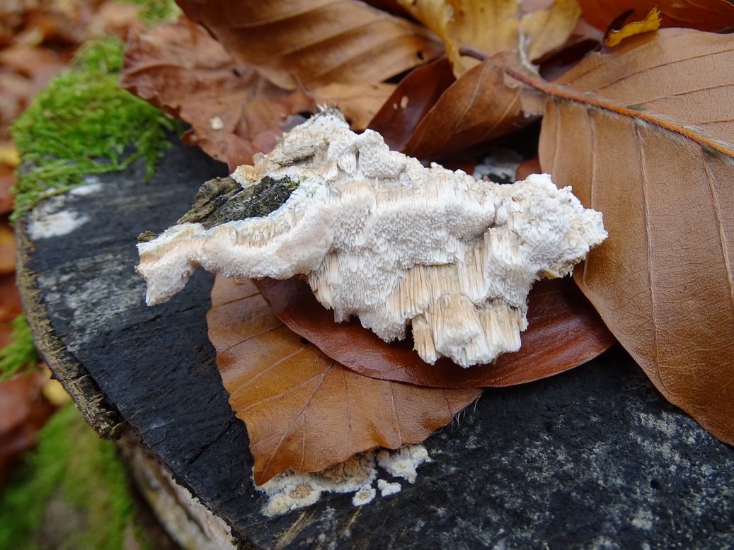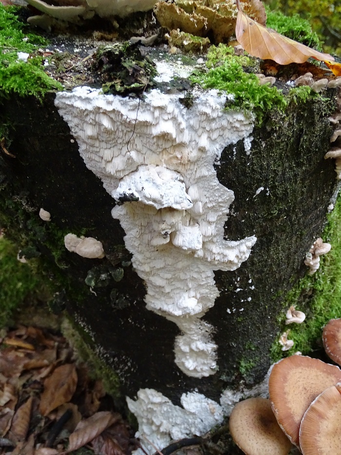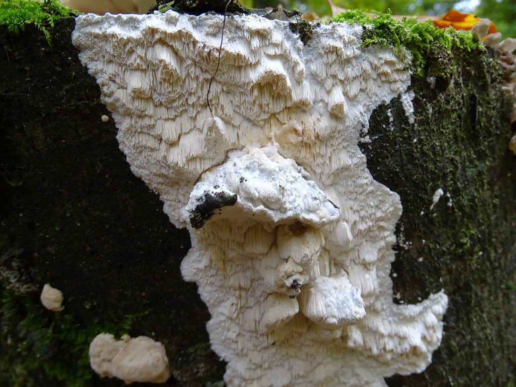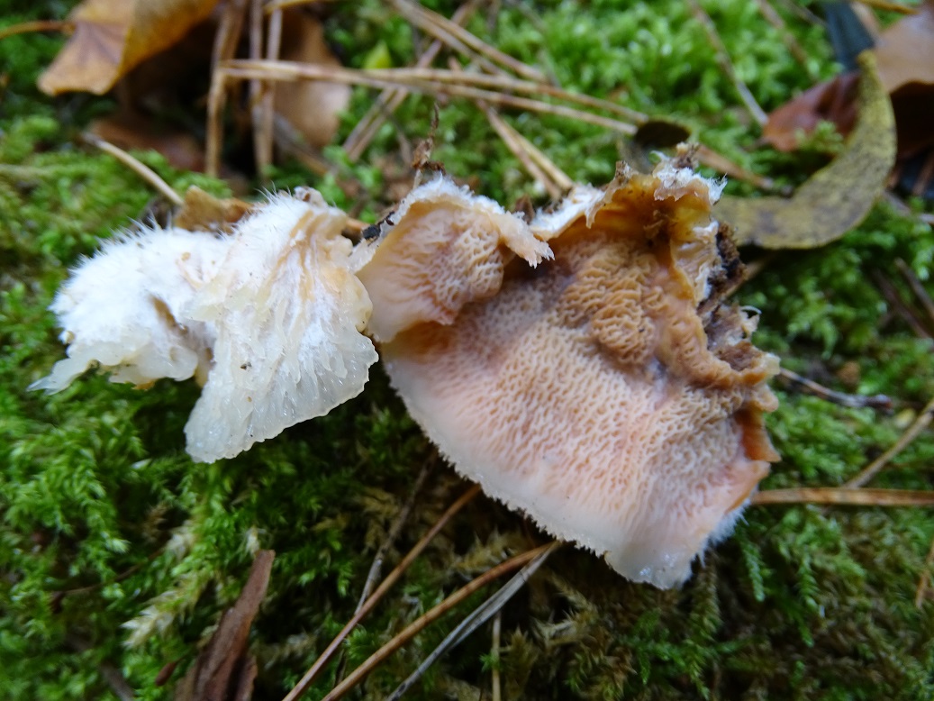 Der zweite ist interessant, wird aber schwierig. Abeja hat es schon angedeutet. In der Tat war Antrodia albida (weißliche Braunfäuletramete) auch meine erster Gedanke, aber ich kenne die mit noch mal mehr zerfransten Poren, auch an den Stellen, wo das Hymenium horizontal ausgerichtet ist. Andererseits hatte ich die noch nicht in so frisch gefunden. Doch da spielen möglicherweise noch ein oder zwei weitere Arten der Gattung mit. Zudem gibt es auch noch großporige Arten bei Oxyporus, die mir unbekannt sind. Die kann ich hier nicht ausschließen. Schizopora wurde schon genannt, aber da wäre die Wuchsweise tatsächlich sehr ungewöhnlich.