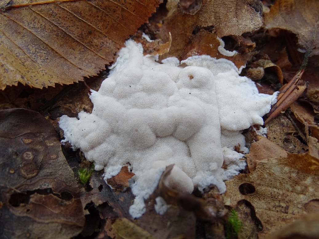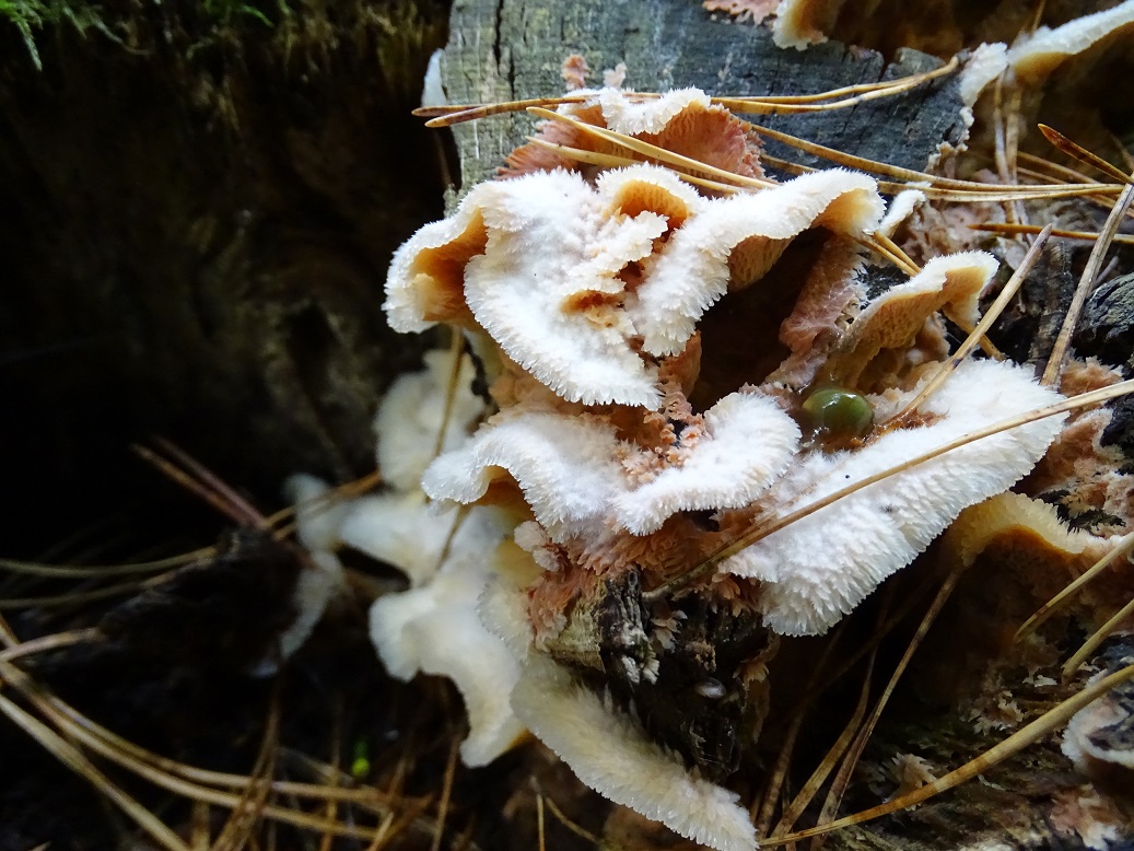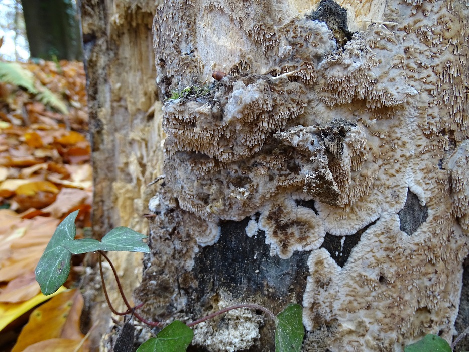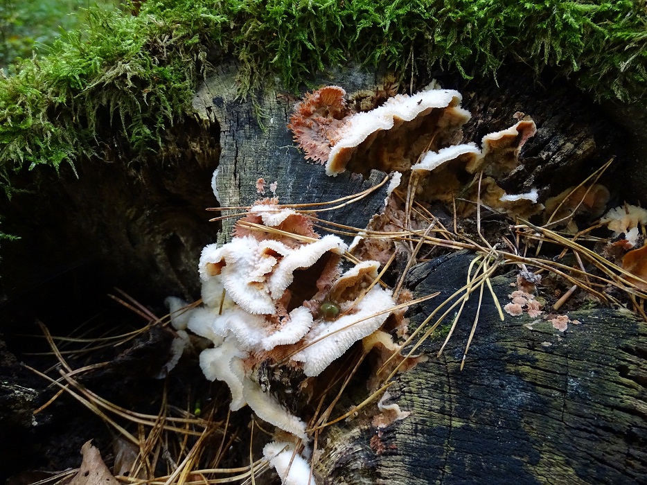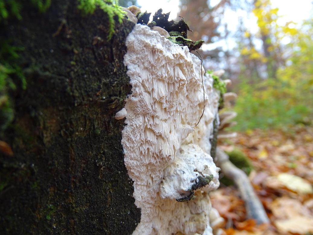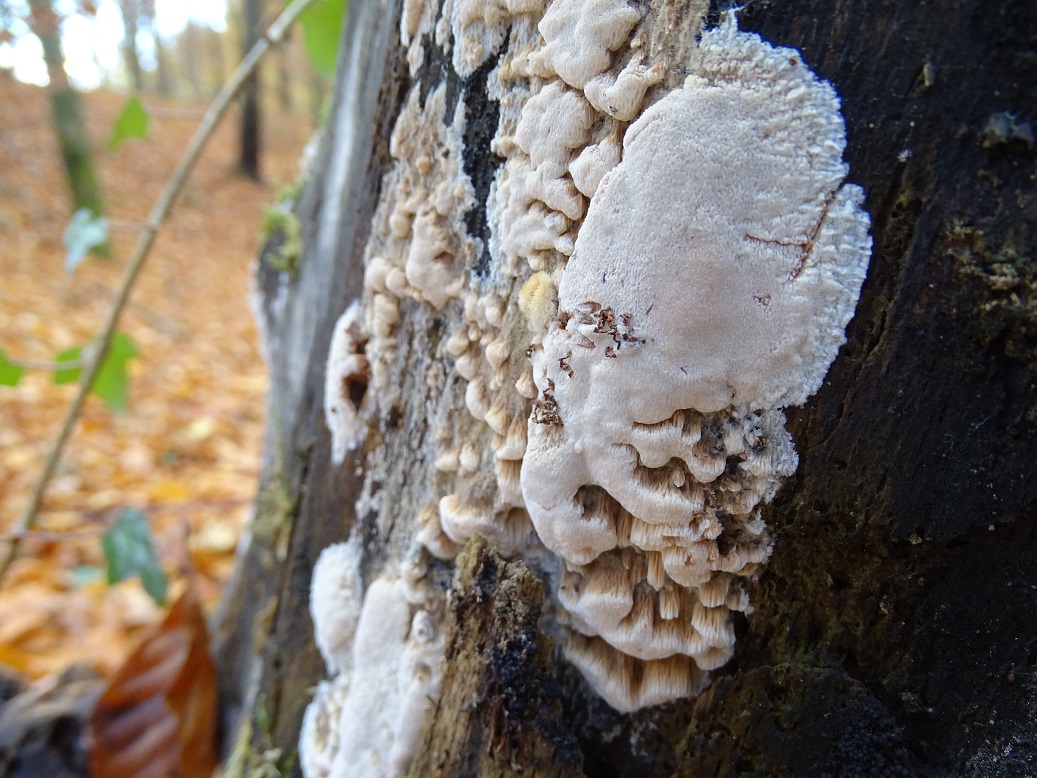 Der zweite ist interessant, wird aber schwierig. Abeja hat es schon angedeutet. In der Tat war Antrodia albida (weißliche Braunfäuletramete) auch meine erster Gedanke, aber ich kenne die mit noch mal mehr zerfransten Poren, auch an den Stellen, wo das Hymenium horizontal ausgerichtet ist. Andererseits hatte ich die noch nicht in so frisch gefunden. Doch da spielen möglicherweise noch ein oder zwei weitere Arten der Gattung mit. Zudem gibt es auch noch großporige Arten bei Oxyporus, die mir unbekannt sind. Die kann ich hier nicht ausschließen. Schizopora wurde schon genannt, aber da wäre die Wuchsweise tatsächlich sehr ungewöhnlich.