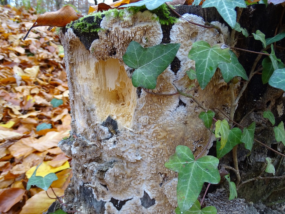 "Nr. 4" scheint zum großen Teil ein ziemlich altes Stadium zu sein. Nur an der linken Seite des Stubbens auch einige jüngere FK. Das ausgefaulte Holz - ist das typisch "Weißfäule"? Dann wären wir aber mit "Braunfäuletramete" deutlich daneben: