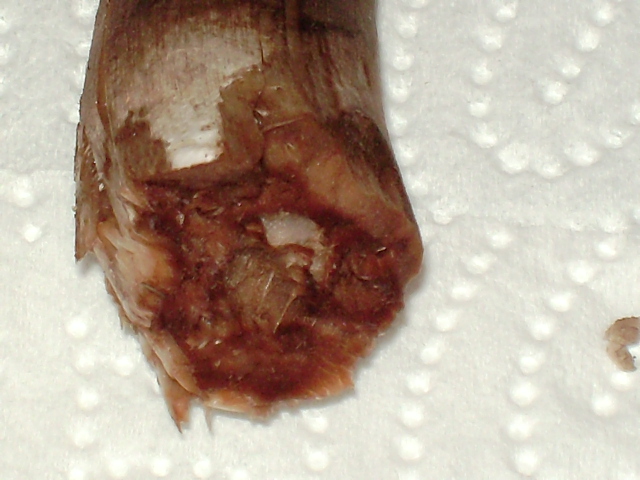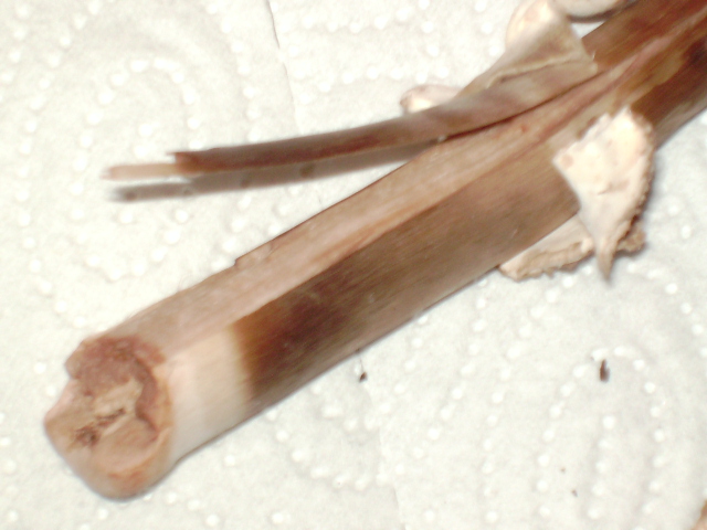 Aus versehen habe ich eine Hälfte des Stiles zertreten, danach hat sich der Selbife folgendermaßen verfärbt . Am Geruch hat sich nichts verändert, auch der zertretene Stil riecht weiterhin angenehm süßlich, campignonartig.