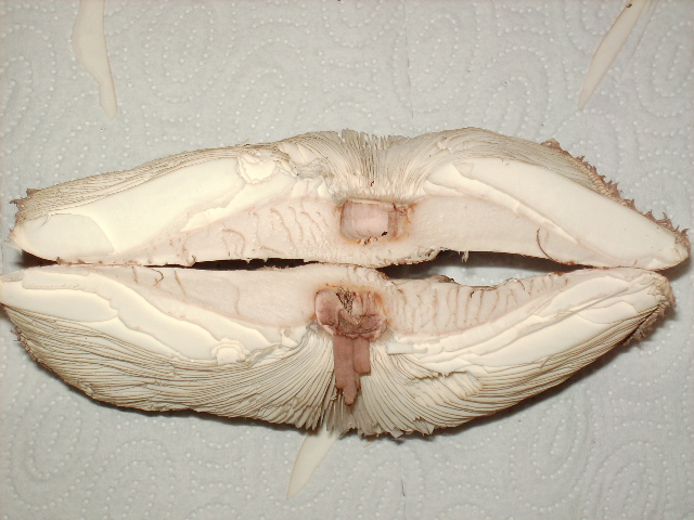 Der Geruch des Pilzes ist angenehm süßlich und erinnerte mich sehr stark nach den Geruch des Champignons und das weiße Lamellenfleisch hat einen, würde ich laienhaft sagen, süßlichen Geschmack. Es gab keinerlei Flüssigkeitsabsondeungen, sprich tortz der meschnaischen Einwirkung auf den Stil bzw. auf das Schirmfleisch blieb alles trocken.