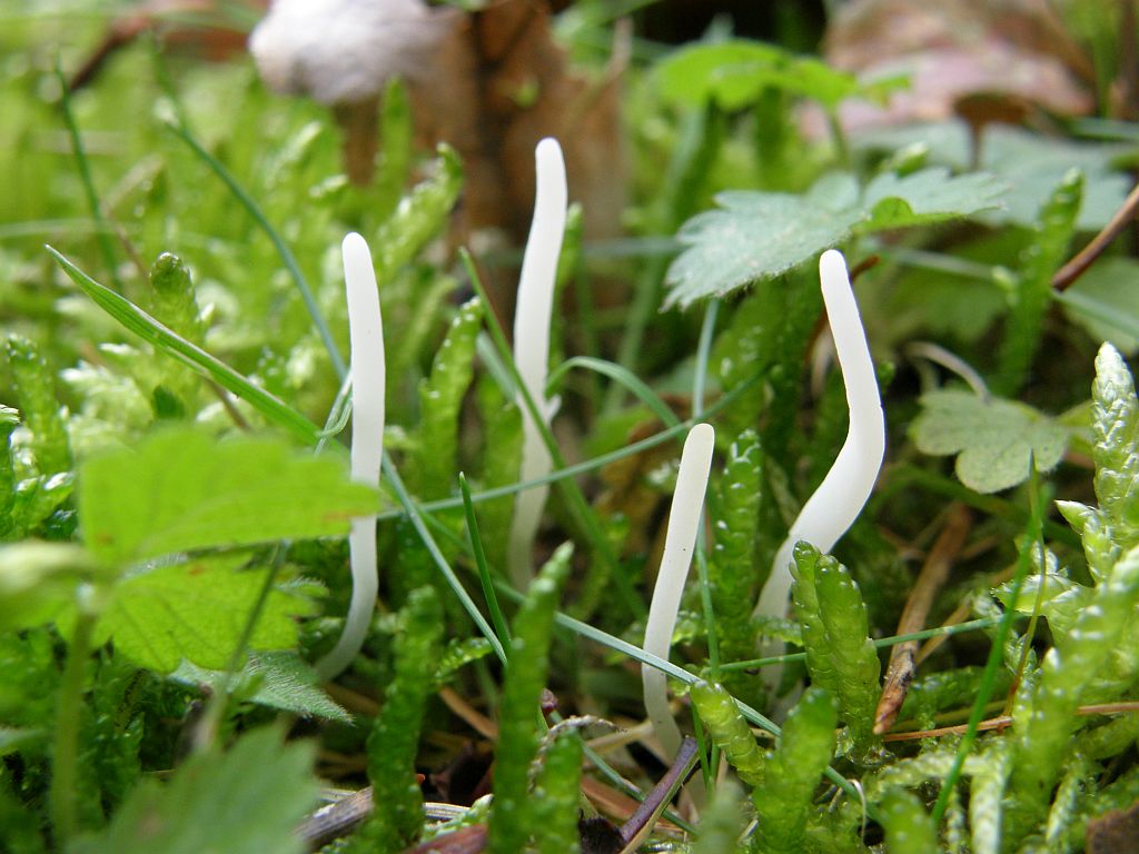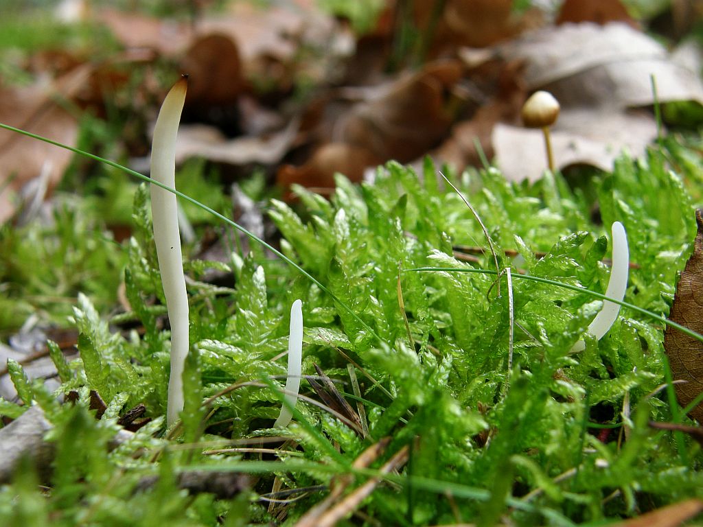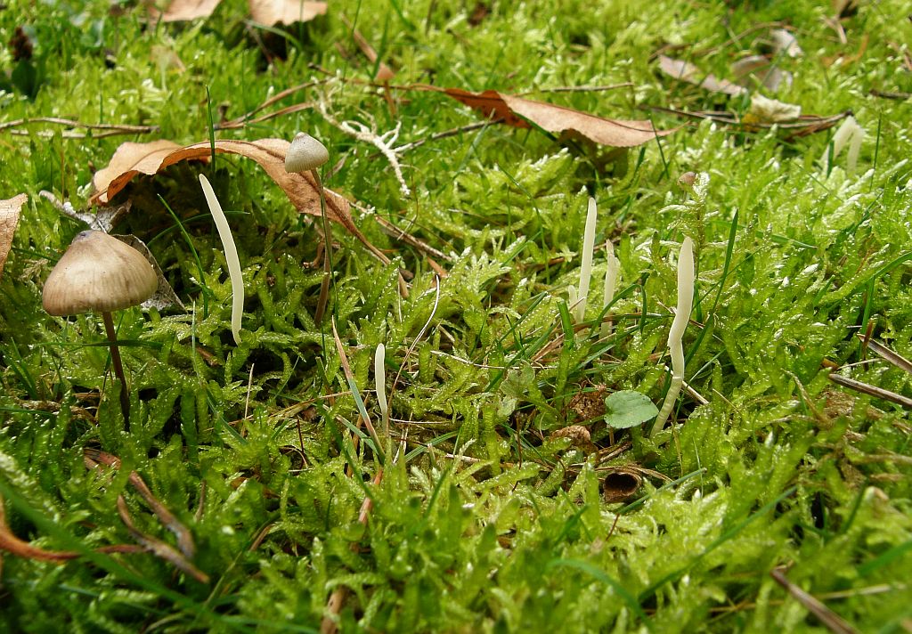 Clavaria candida + Clavaria falcata (kleiner FK in der Mitte) + Mycena olivaceomarginata = Olivschneidiger Helmling
