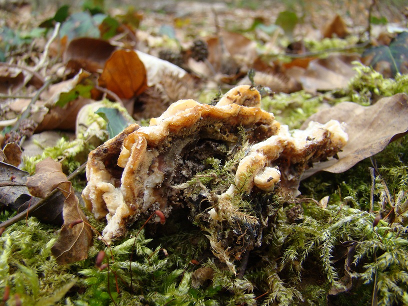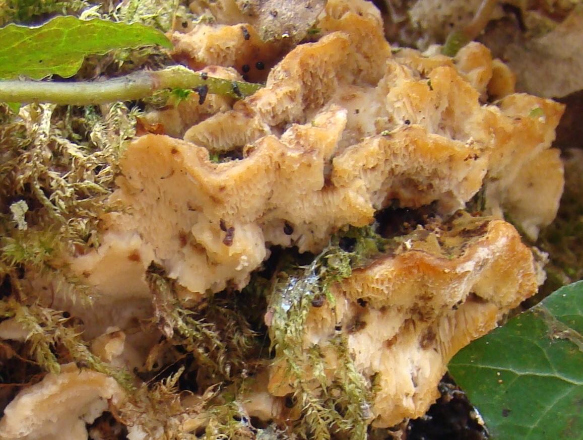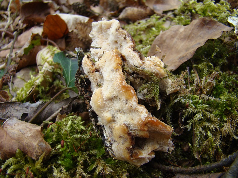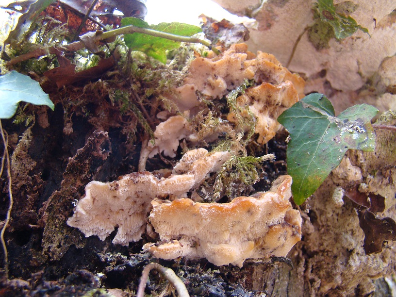 bevor ich die nächsten Tage nochmal zu meiner Antrodia cf. albida (Bild Nr. 2) gehe, hier aus m einem Fundus von Anfang des Jahres (12.04.15) ein paar Bilder von einem Bestand, den ich eher zu Antrodia serialis - Reihige Braunfäuletramete - stellen würde.