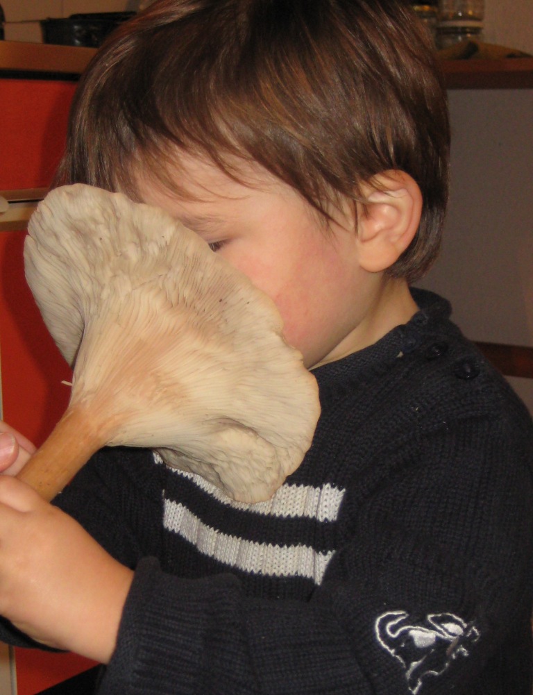 Und nun: Hut ausgeprägt trichterförmig, auch bei jüngeren Exemplaren, die größten Fruchtkörper am Fundort bis 25cm(!) breit. Oberfläche so wie Lamellen bräunlich-krämfarbig, Pilzfleisch weiß. Oberfläche trocken und glatt.