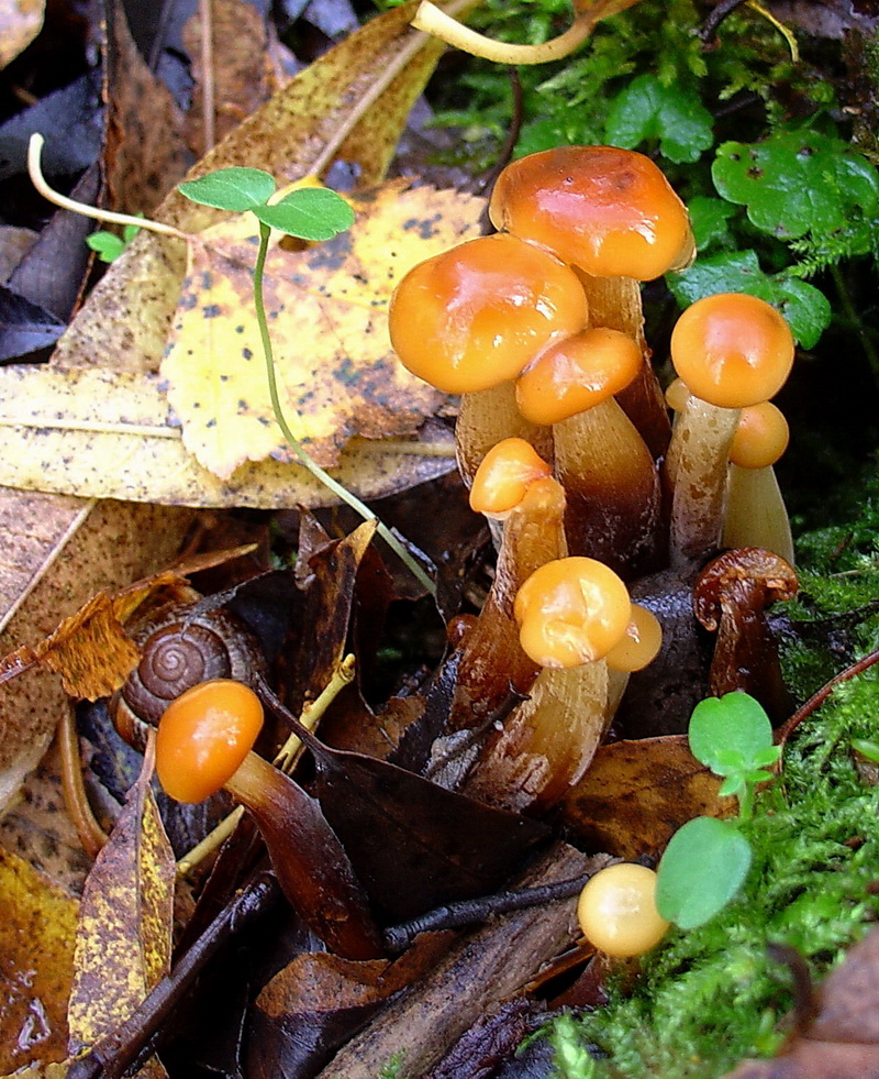 Samtfußrüblinge haben keinen Stielring, eine orangene Hutoberfläche und einen mehr oder weniger orangenen bis samtig-dunkelbraunen Stiel. Das hier sind Buchen-Schleimrüblinge.