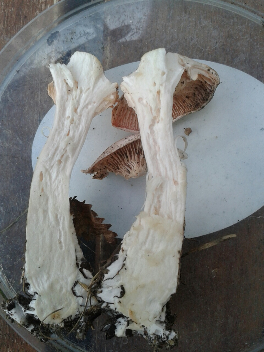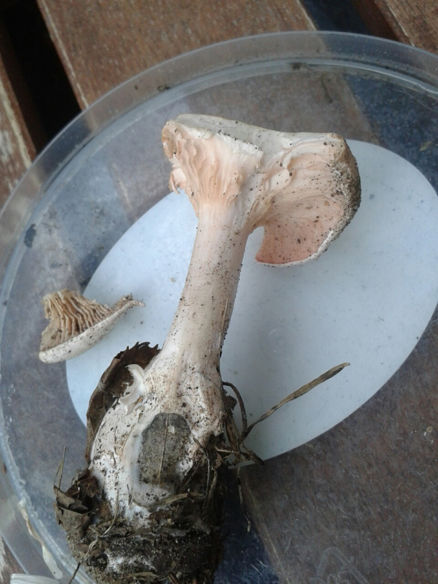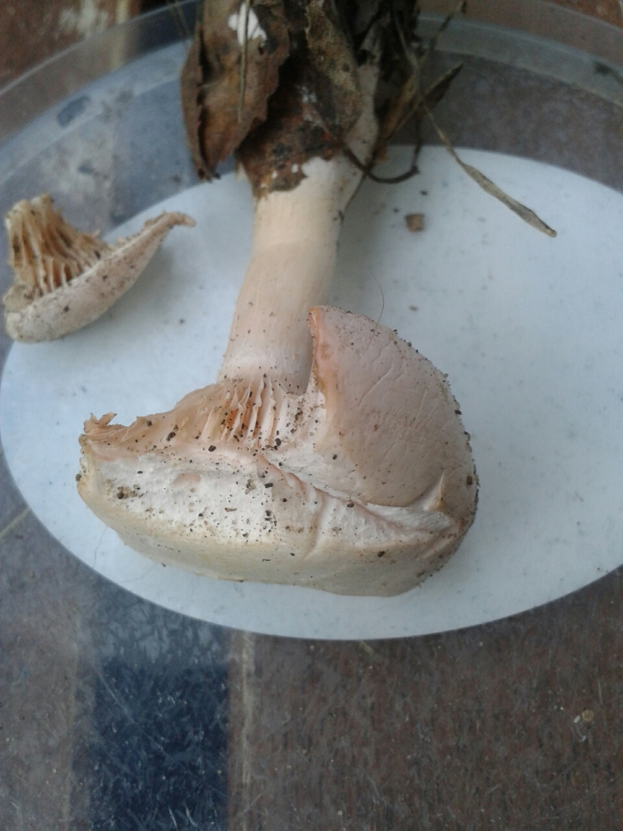 Huthaut blass, aber deutlich rosa (wesentlich deutlicher als die Lamellen des Rosablättrigen Helmlings, nach dem ich vor einiger Zeit mal gefragt hatte). Lamellen noch intensiver Rosa und mit dem Fingernagel abschiebbar. Mich hat der Pilz zunächst an einen Rötelritterling erinnert, weshalb ich es versucht habe. Kommt die Ablösbarkeit der Lamellen eigentlich auch bei anderen Gattungen vor? Die Lamellen laufen am Stiel herab wie beim Fuchsigen Rötelritterling oder vielen Trichterlingen, ich glaube, man erkennt es im Schnittbild. Also nicht "ritterlich" ausgebuchtet wie beim Violetten.