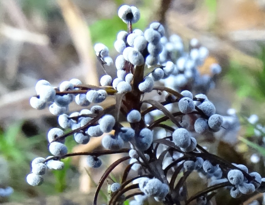 Die kleinen weißen Schleimis haben hier das Schöne Widertonmoos - Polytrichum formosum - befallen, das wirkte wie winzige winterliche Weihnachtsbäumchen. Die weißen Kügelchen sind nicht glatt, wirken filzig, sind deutlich gestielt und abgeflacht. Die Stiele sind dunkel und in die Kügelchen eingesenkt, so dass unter dem Bino der Eindruck von einem richtig gestielten winzigen Hutpilz entsteht.
