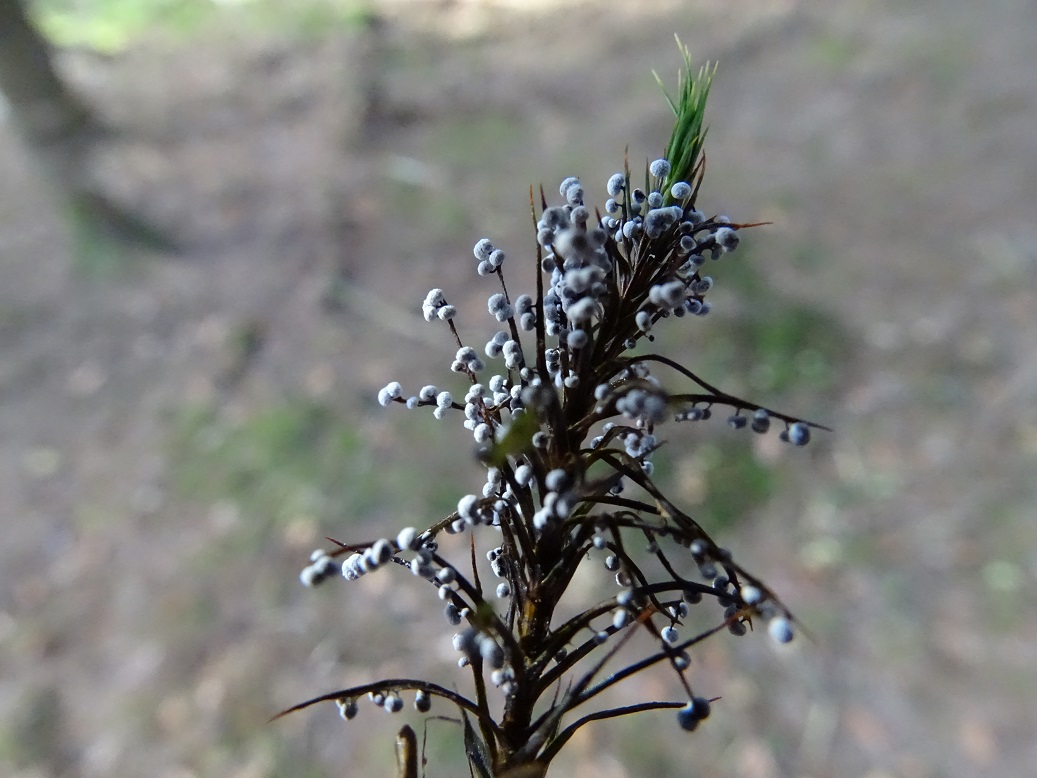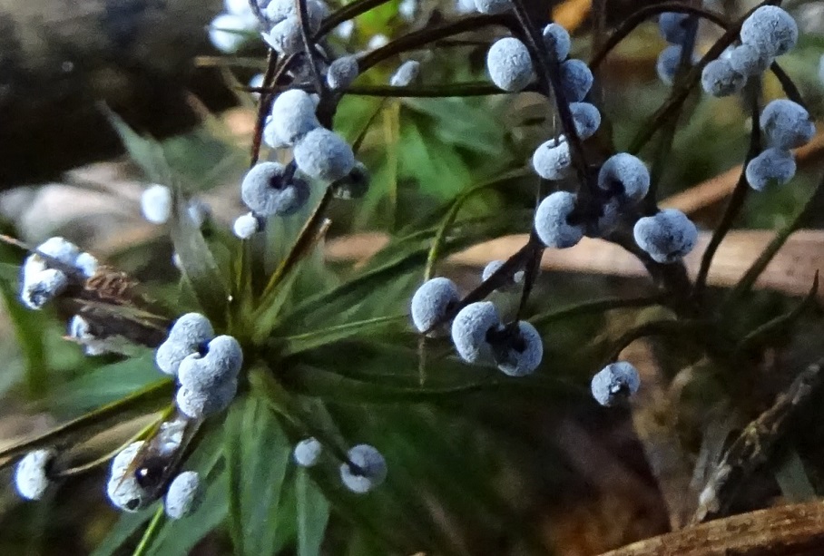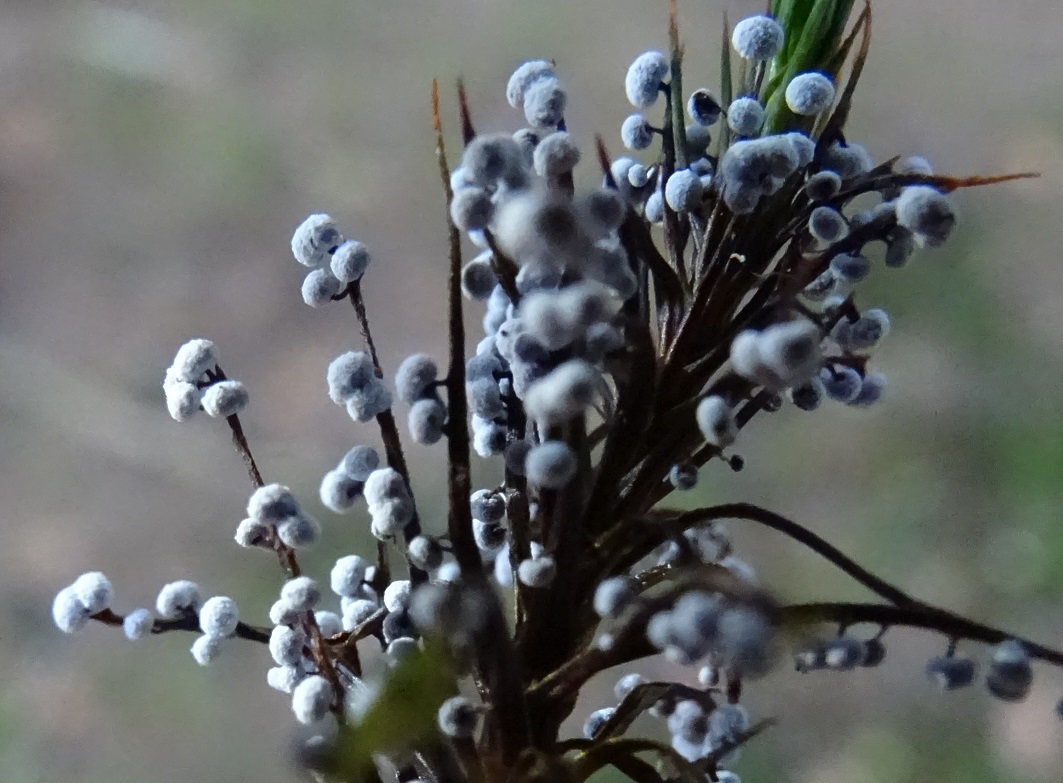 Die kleinen weißen Schleimis haben hier das Schöne Widertonmoos - Polytrichum formosum - befallen, das wirkte wie winzige winterliche Weihnachtsbäumchen. Die weißen Kügelchen sind nicht glatt, wirken filzig, sind deutlich gestielt und abgeflacht. Die Stiele sind dunkel und in die Kügelchen eingesenkt, so dass unter dem Bino der Eindruck von einem richtig gestielten winzigen Hutpilz entsteht.