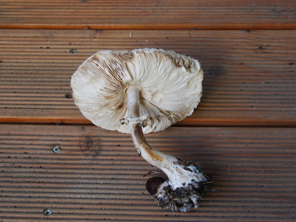Ich hätten den jetzt fast als gemeinen Safranschirmling CHLOROPHYLLUM RACHODES OLIVIERI abgelegt, aber den kenne ich nur deutlich kleiner und dünnfleischger. Der Hut vom größten Pilz auf dem Bild hatte etwa einen Durchmesser von 23cm und eine Dicker von 2,5cm (6cm mit Lamellen). Vor Ort gab es noch größere, dickere Exemplare, die aber schon deutlich überständig waren. Beim CHLOROPHYLLUM RACHODES OLIVIERI liest man immer was von maximal 17-20cm. Die ausgewachsenen Exemplare in der Gruppe waren aber alle deutlich größer als 20cm im Durchmesser und ziemlich "massiv".