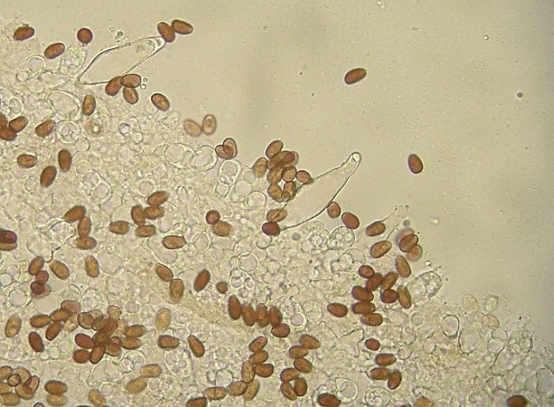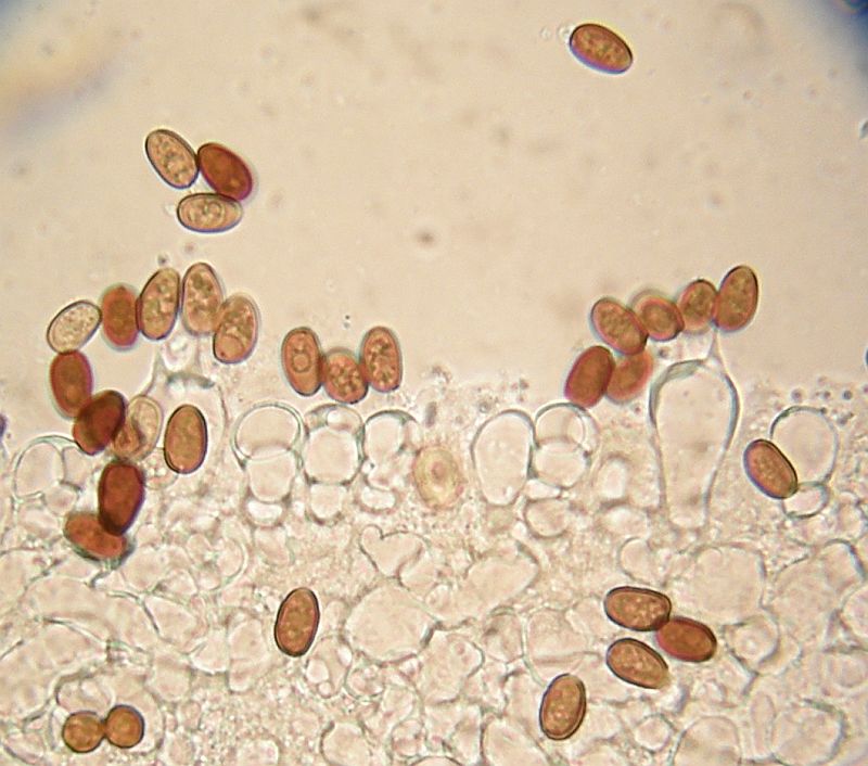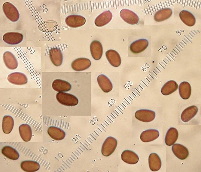 Sporen dunkel rotbraun in H2O, bis 9x5 (meist 8x5), KP teils rel. deutlich aber klein, je nach Sichtweise lateral oder zentral, Sporenform elliptisch bis etwas tonnenförmig, an einem Ende teils etwas abgeplattet, nicht phaseoliform; Sporenpulver dunkel graubraun mit Violetton