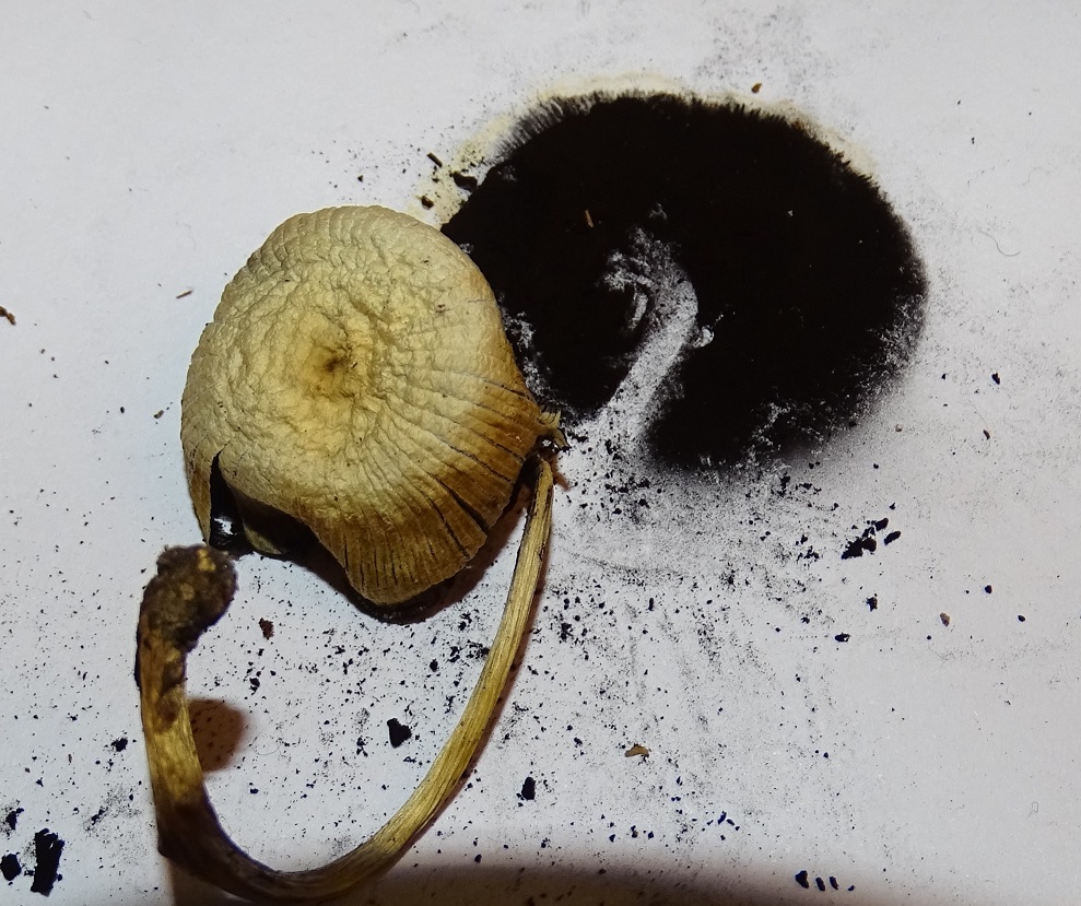 Heute habe ich noch ein Bild auf dem Schreibtisch vom getrockneten Pilz mit Sporenabwurf gemacht, evtl. gibt das ja noch Informationen: