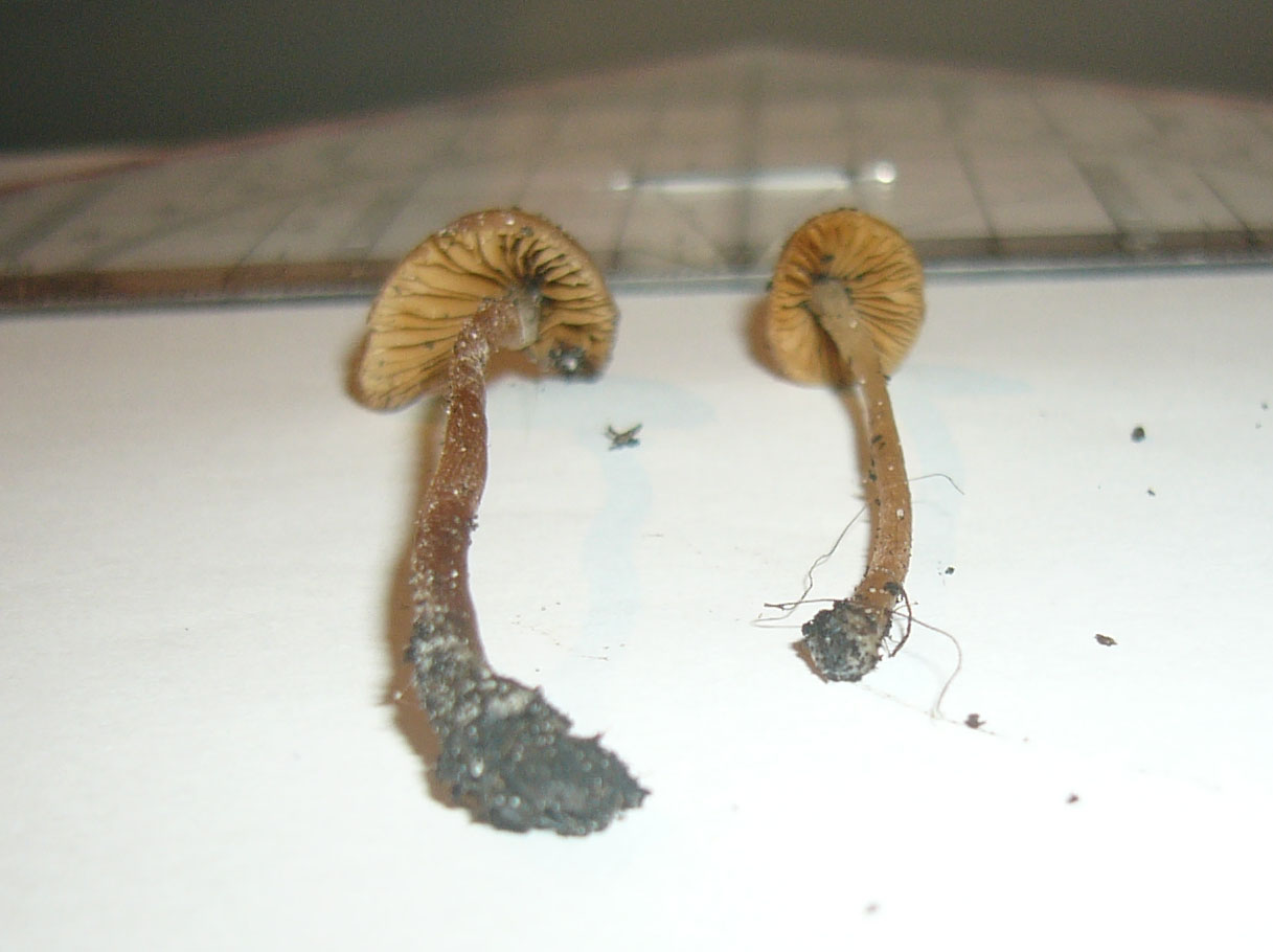 Der weiß bereifte Stiel, der Habitus und die orangebraunen Lamellen würde für Samthäubchen (Conocybe) sprechen.