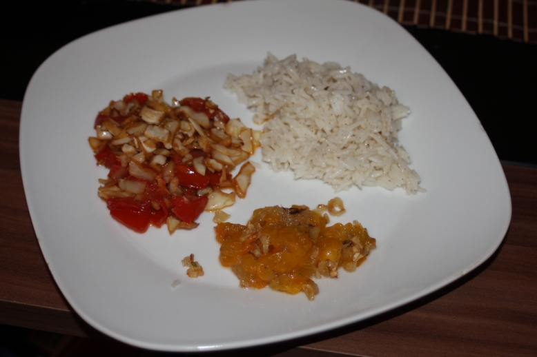 Also, ich hab's ziemlich simpel zubereitet: auf wenig Pflanzenöl Knoblauch leicht geröstet, dann die vorher im Wasser angequollenen Goldis dazugegeben, gesalzen, etwa 15 Minuten lang auf mittlerer Flamme weiter geschmoren, raus damit auf den Teller. Im selben Öl und mit ein wenig Soja-Souce dann kleingeschnittenen Weißkohl mit einer Cherry-Tomaten geschmoren, auch etwa 15 Minuten lang. Währenddessen noch schnell paar Esslöffel Basmati-Reis gekocht.
