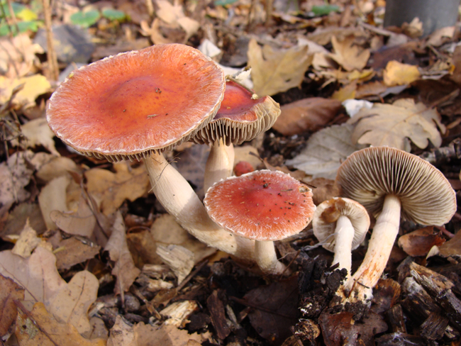 Nun hab ich ihn auch gefunden, den Orangeroten Träuschling. Er wurde ja schon in der letzten Woche im Forum diskutiert. Dass er nun auch im NSG Emsdettener Venn (Nord-Westfalen) zu Hause ist, darüber bin ich erstaunt. Meine Art hat eine leuchtend rote Hutform, so dass man meinen könnte, es handelt sich um die rötliche Form des Schuppigen Träuschlings (Stropharia squamosa var. Thrausta). Deer Pilz wuchs auf Holzhäcksel, in der Nachbarschaft standen Birken. Hier bin ich überfordert! Bitte um Hilfe!