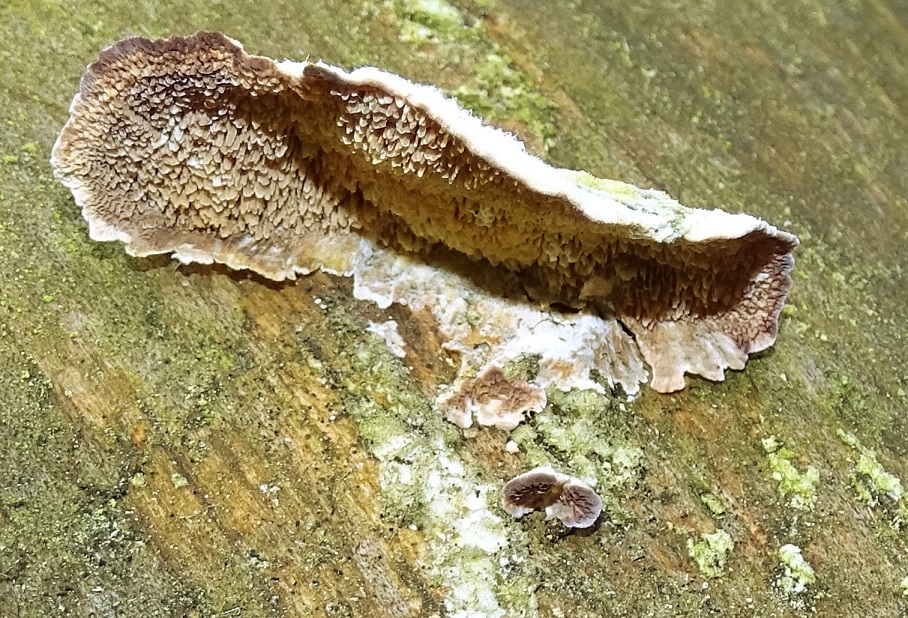 Nummer 5 ist Trichaptum fuscoviolaceum (Zahnförmiger Violettporling)