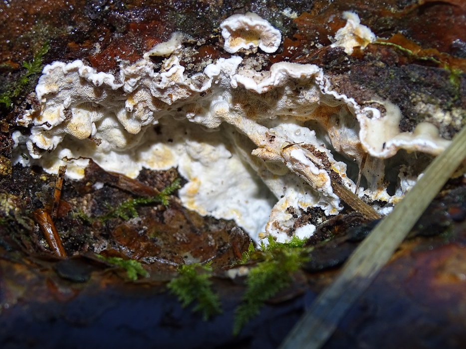 5. - vom gleichen Stamm, aber wohl doch nicht Phlebia tremellosa, wie ich zuerst dachte (die "darf" ja auch nicht an Pinus ...) - aber was es ist, leider keine Idee. Leider sind die Pilze auch schon etwas "spät dran":