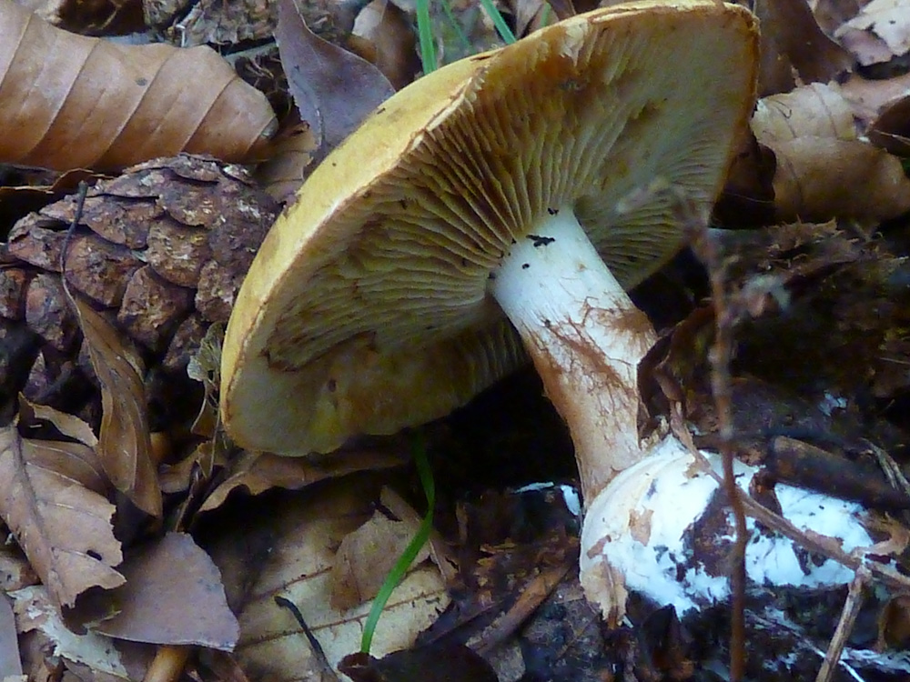 Dann habe ich mir das Foto noch mal genau angesehen; da fiel es mir wie Schuppen aus den Haaren: ein Kiefernzapfen neben dem Pilz! Ich war felsenfest davon überzeugt: es war ein reiner Buchenwald, also konnte es ja nur ein Röhrling bei Buche sein