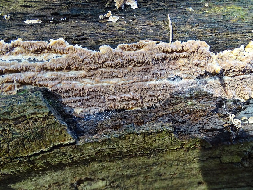 7. - nochmal ein graubrauner Krustenpilz, ob das gleiche wie Nr. 3 - bestimmt nicht, ganz andere Struktur und geht eher ins Rosaliche: