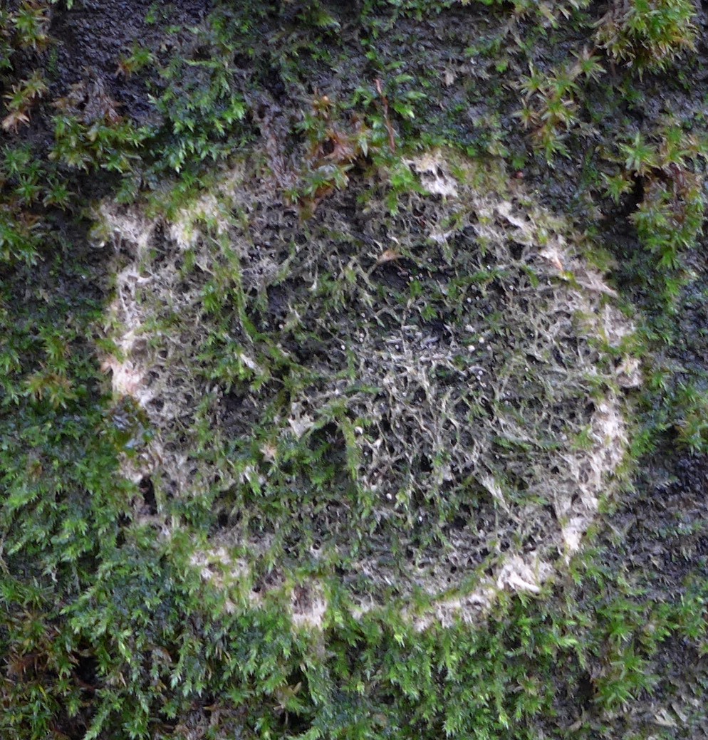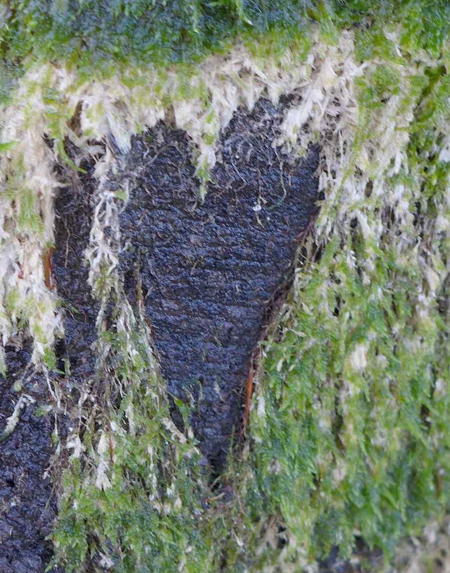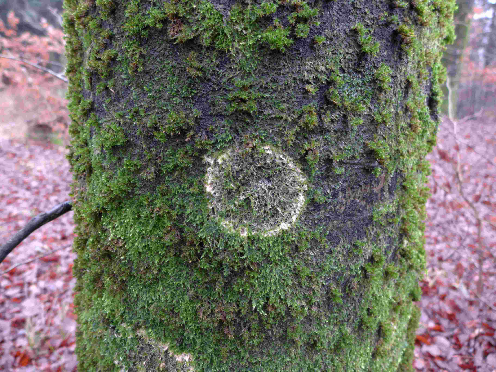 (1) In dieser Art gab es viele Baumstämme. Am Rand verliert das Moos sein Blattgrün. Beim Moos handelt es sich um das Zypressen-Schlafmoos (Hypnum cupressiformis), das den Stamm mattenförmig bedeckt. Dazwischen wächst auch in Büscheln das Laubmoos Orthotrichum spec.