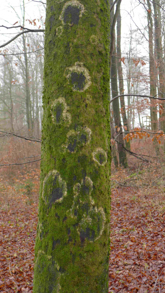 vor ein paar Wochen und auch heute habe ich an Buchen (Fagus sylvatica) gesehen, dass das Moos, das auf den Stämmen wächst, anscheinend abgefressen wird. In diesem Jahr fällt es besonders auf. Es regnet seit einigen Wochen häufig.
