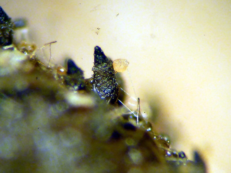 Substrat ist Kaninchendung. Und zwar genau die Probe, auf der auch Trichobolus dextrinoideosetosus vorkam. Die sind seit einiger Zeit verschwunden, dafür erscheinen jetzt kleine sattgelbe Apos, die auf Perithecien von S. tetrasporum wachsen.