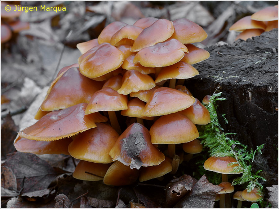 dieser scheinbar banale Samtfußfübling brachte mich auf dem Bestimmungsweg ins stolpern; die Sporen / Sporenquotient sind für Flammulina velutipes zu klein. Im GRÖGER konnte ich diese Aufsammlung nicht bestimmen, in der FN kommt da nur Flammulina populicola in Fragen und auch im Schlüssel von PETERSEN, HUGHES & REDHEAD kommt ebenfalls nur F. populicola in Frage.