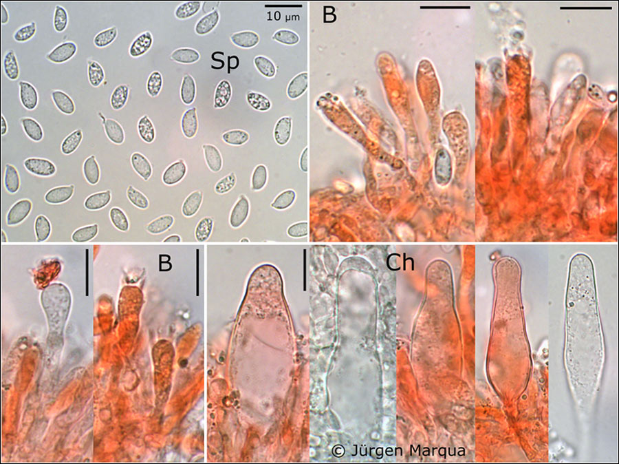 Sporen: [95% –• 23 –• SAP –• v –• H2O(nat) ] = 6,5 - 7,4 - 8,3 x 3,3 - 3,9 - 4,4 µm; Q = 1,7-1,9-2,2. Basidien 4-sporig, Cheilozystiden lageniform, zerstreut. Hyphen mit Schnallen. HDS mit großen Pileozystiden.