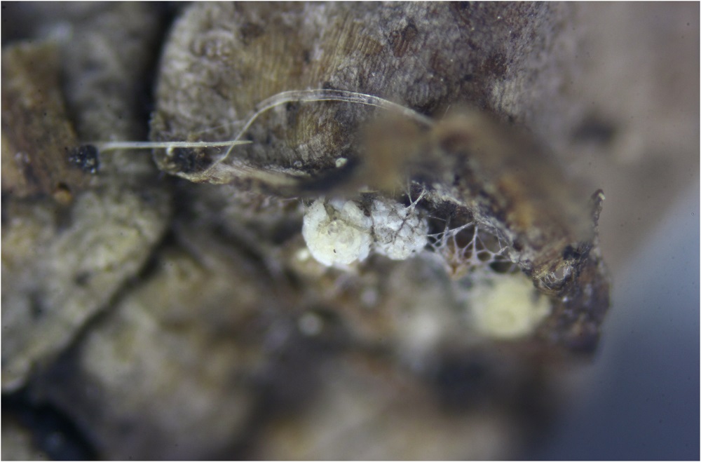 Gestern hatte ich an einem Kieferzweig (den ich gut bewässert in einer Plastiktüte mit Verschluss aufbewahrt hatte) mehrere unbekannte kleine weiße Punktartigen Pilze gefunden.