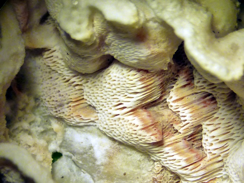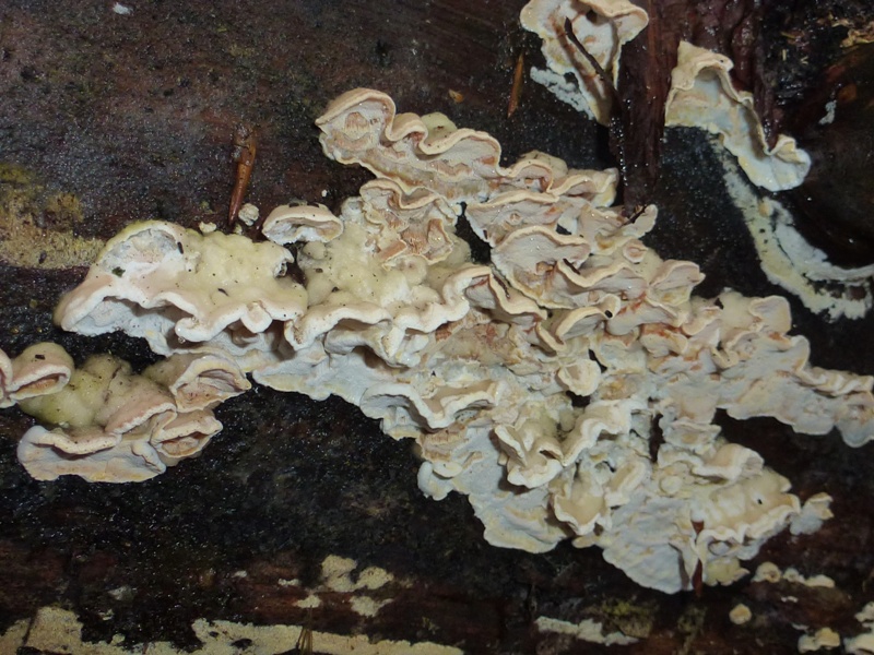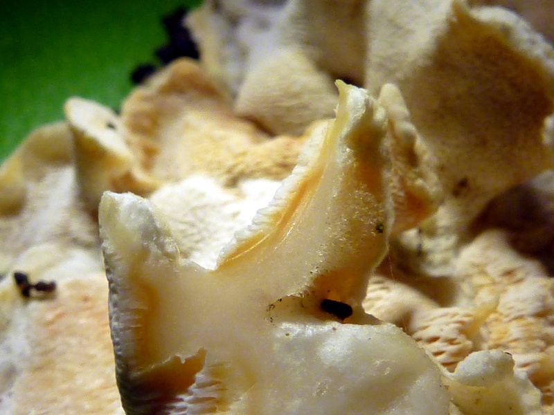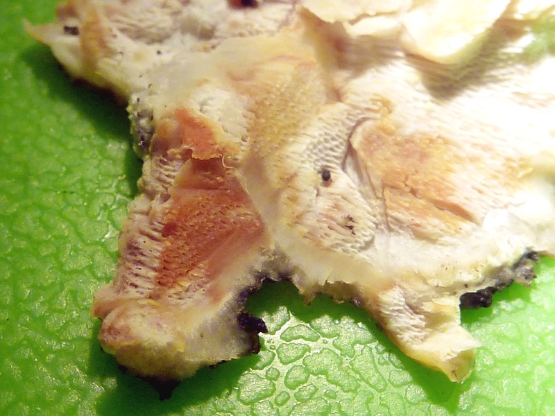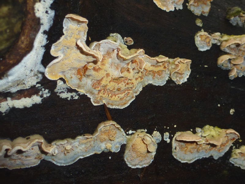 Gefunden an einer liegenden Kiefer. Die Hutkanten sind gräulich-weiß und sehr feinfilzig. Die Poren sind eckig, teilweise langgezogen. Die Porenschicht ist an der Basis orange verfärbt, was bei älteren Poren bis an die Oberfläche durchschlägt. Die Konsistenz ist knorpelig zäh, Proben lassen sich aber leicht vom Substrat lösen. Auf Verletzung reagiert das Teil nicht, wenn man das durchscheinen der Orangefarbenen Unterschicht beim abkratzen der oberen weißen Schicht weglässt.