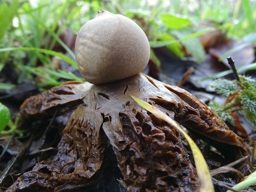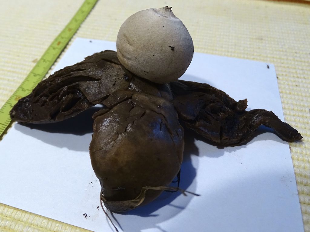 Für mich daher Geastrum triplex (Halskrausenerdstern), bei dem die "Halskrause" einfach nur verfallen ist. Die besteht aus eher unbeständigem Material im Gegensatz zur Unterseite der Exoperidie und wird im laufe des Winters meist abgetragen. Überwinterte Exemplare von Geastrum triplex haben dann nur noch die dünnen Lappen ohne irgendwelche Halskrausen.