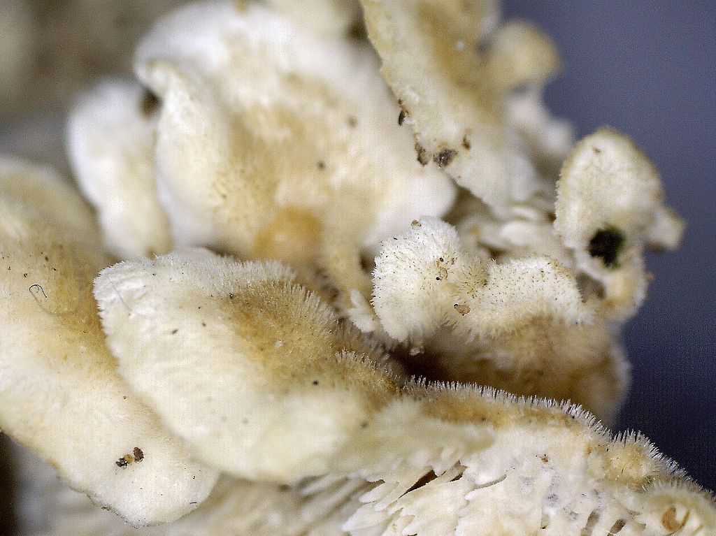 Ich habe noch 3 Makro-Fotos beigefügt, die evtl. hilfreich sein könnten (von dem Fund-Exemplar, welches allerdings schon ein paar Tage im Gemüsefach des Kühlschranks verbrachte ;) ). Bild 1 zeigt die Oberseite kleinerer Exemplare aus dem Gesamtkomplex, Bild 2 und 3 die Unterseite an verschiedenen Stellen.